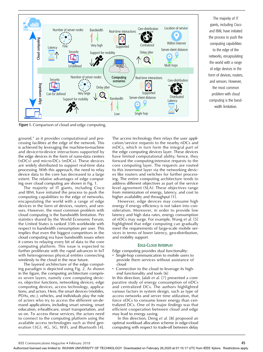 为了处理上述云平台的限制,Cisco公司边缘计算的创新概念,其被广泛的认为是接地气的云,因为其提供了可计算和可编程的设施在网络的边缘,这些被完成通过利用由nDCs和mDCs的形式的边缘设备提供的机器对机器设备对设备的交互,这些设备广泛的被分布去支持实时数据处理,通过这种方法,将设备数据传到核心的需求将会大幅度降低,在图1中展示了边缘计算较云计算的相关优势。