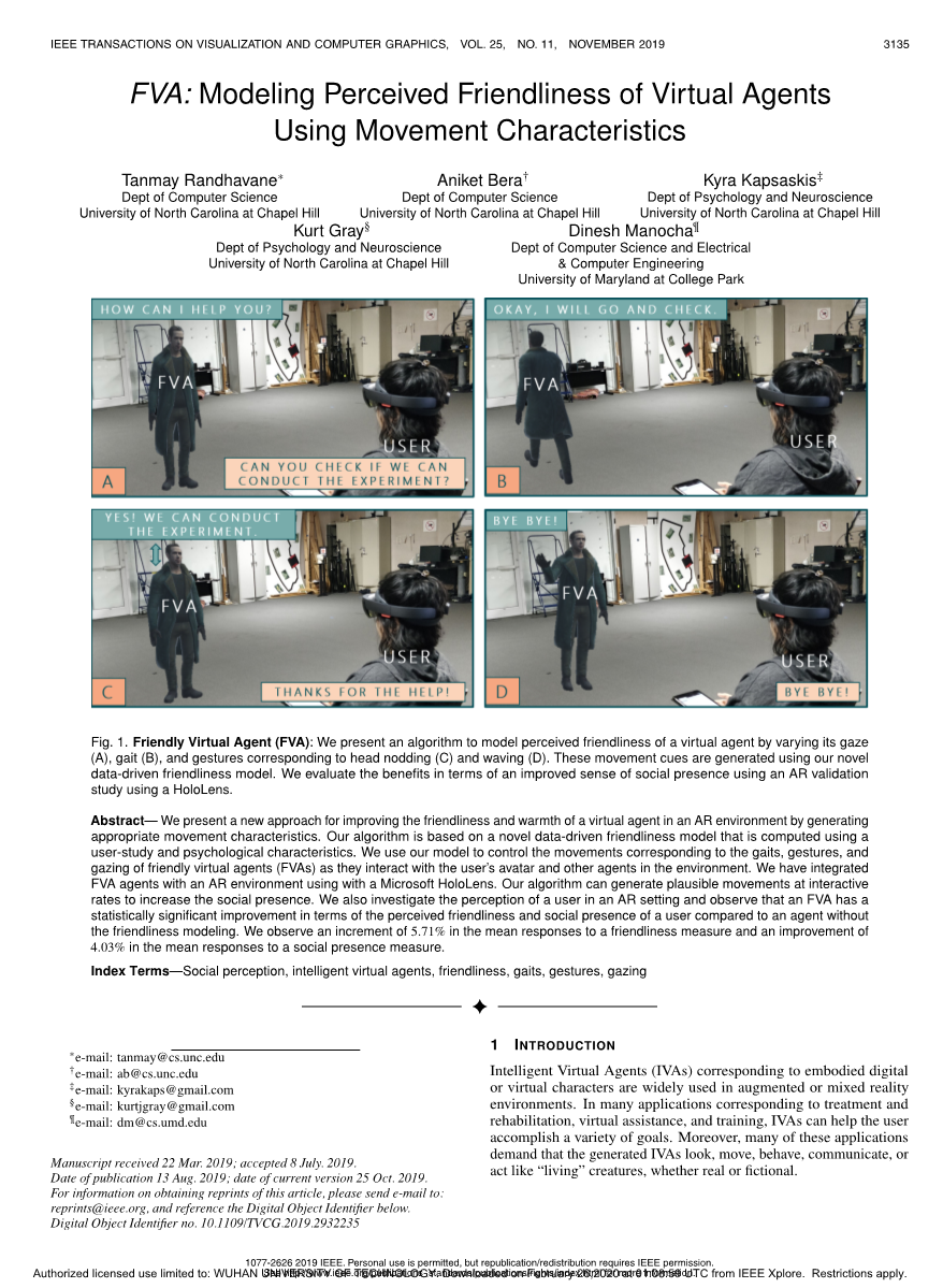 图1.(虚拟代理)FVA:友好虚拟代理(FVA):我们提出了一种算法,可通过更改虚拟代理的注视(A),步态(B)和与头部点头(C)和挥动(D)相对应的手势来对虚拟代理的感知友好性进行建模。这些运动提示是使用我们新颖的数据驱动友好模型生成的。我们通过使用HoloLens的AR验证研究,从改善的社会存在感来评估收益。