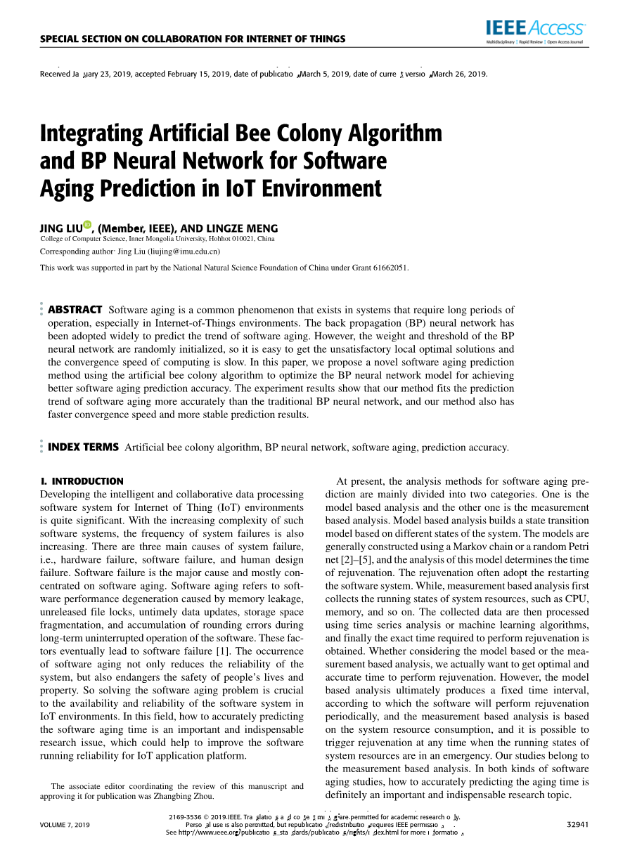 集成人工蜂群算法和BP神经网络的物联网环境软件老化预测