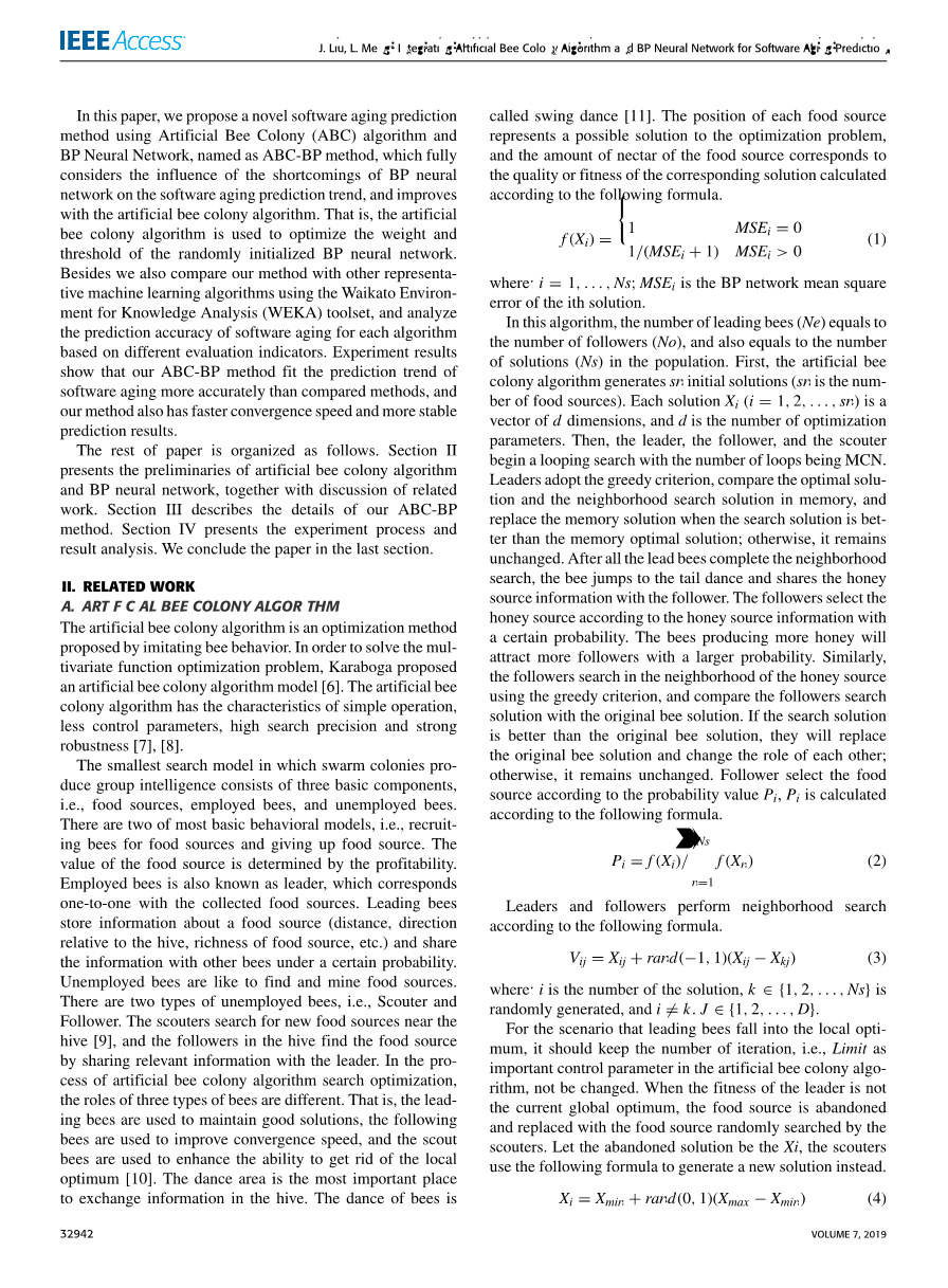 本文提出了一种基于人工蜂群算法(ABC)和BP Neural Network的命名为ABC-BP方法的软件预测方法,该方法充分考虑了BP神经网络对软件预测趋势的影响,并通过人工蜂群算法进行了改进。也就是说,使用人工蜂群算法来优化随机初始化的BP神经网络的权重和阈值。此外,我们还将我们的方法与使用“ Waikato知识分析环境”(WEKA)工具集的其他代表性机器学习算法进行比较,并根据不同的评估指标分析每种算法的软件老化的预测准确性。 实验结果表明,与比较方法相比,我们的ABC-BP方法能更准确地预测软件老化的趋势,并且收敛速度更快,预测结果更稳定。 其余论文的结构如下。 第二节介绍了人工蜂群算法和BP神经网络的初步知识,并讨论了相关工作。 第三节详细介绍了我们的ABC-BP方法。 第四节介绍了实验过程和结果分析。 我们在最后一部分总结了本文。