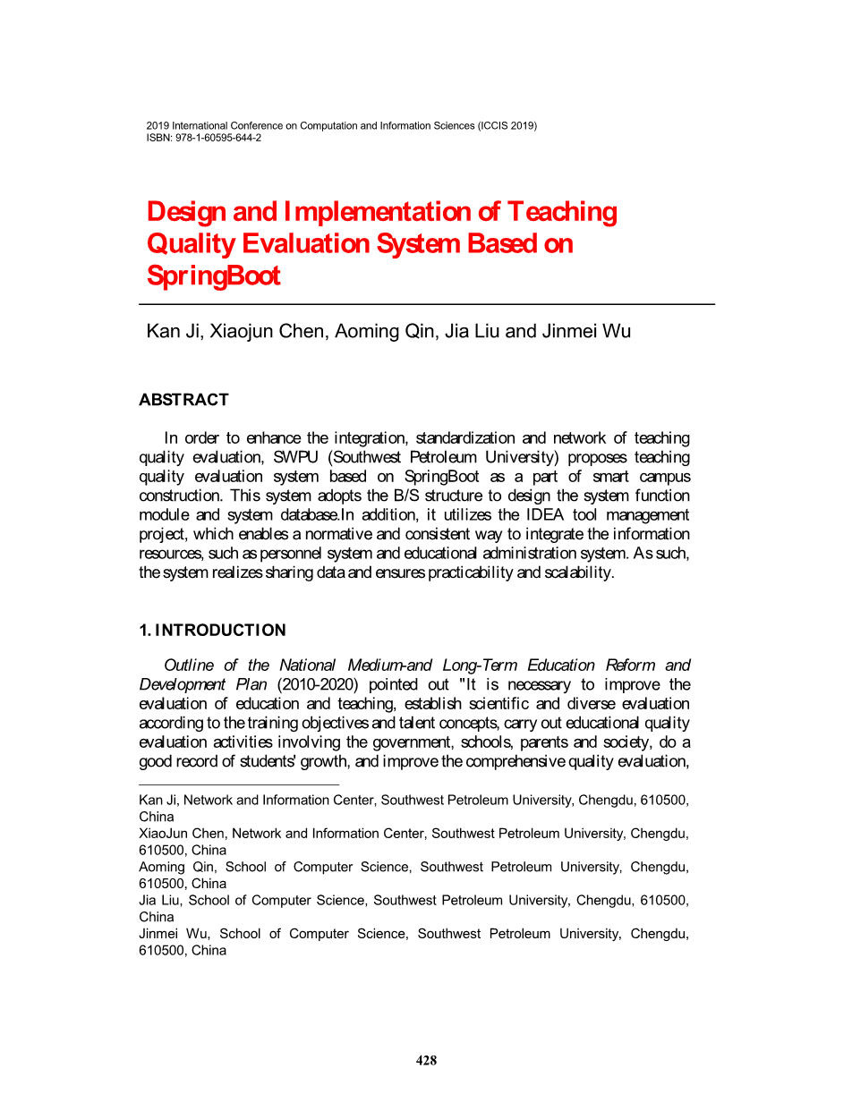 本文针对我校(即西南石油大学SWPU)的教学质量评价体系,提出了基于 Spring Boot的教学质量评价体系管理系统,使教学质量评价体系能够适应智慧校园建设的新要求、新标准。