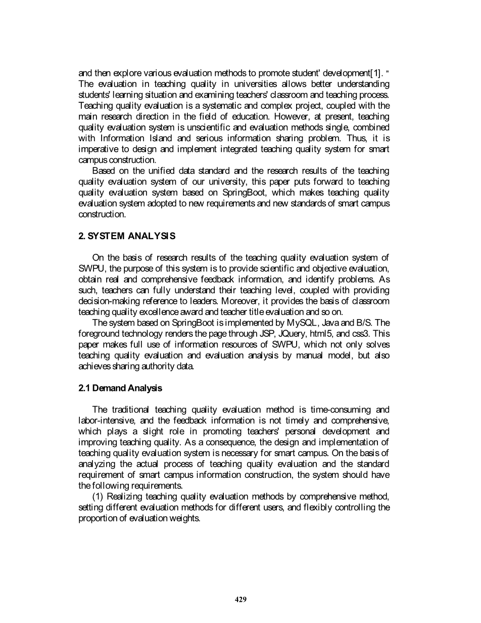 为加强教学质量评估的一体化、规范化和网络化,西南石油大学(SWPU)提出了基于Spring Boot的教学质量评价系统,并将其作为智慧校园建设的一部分。本系统采用B/S结构来设计系统功能模块和系统数据库。并利用IDEA工具管理该项目,以规范、一致的方式集成人事系统、教务管理系统等信息资源。该系统实现了数据共享,并保证了系统的实用性和可扩展性。