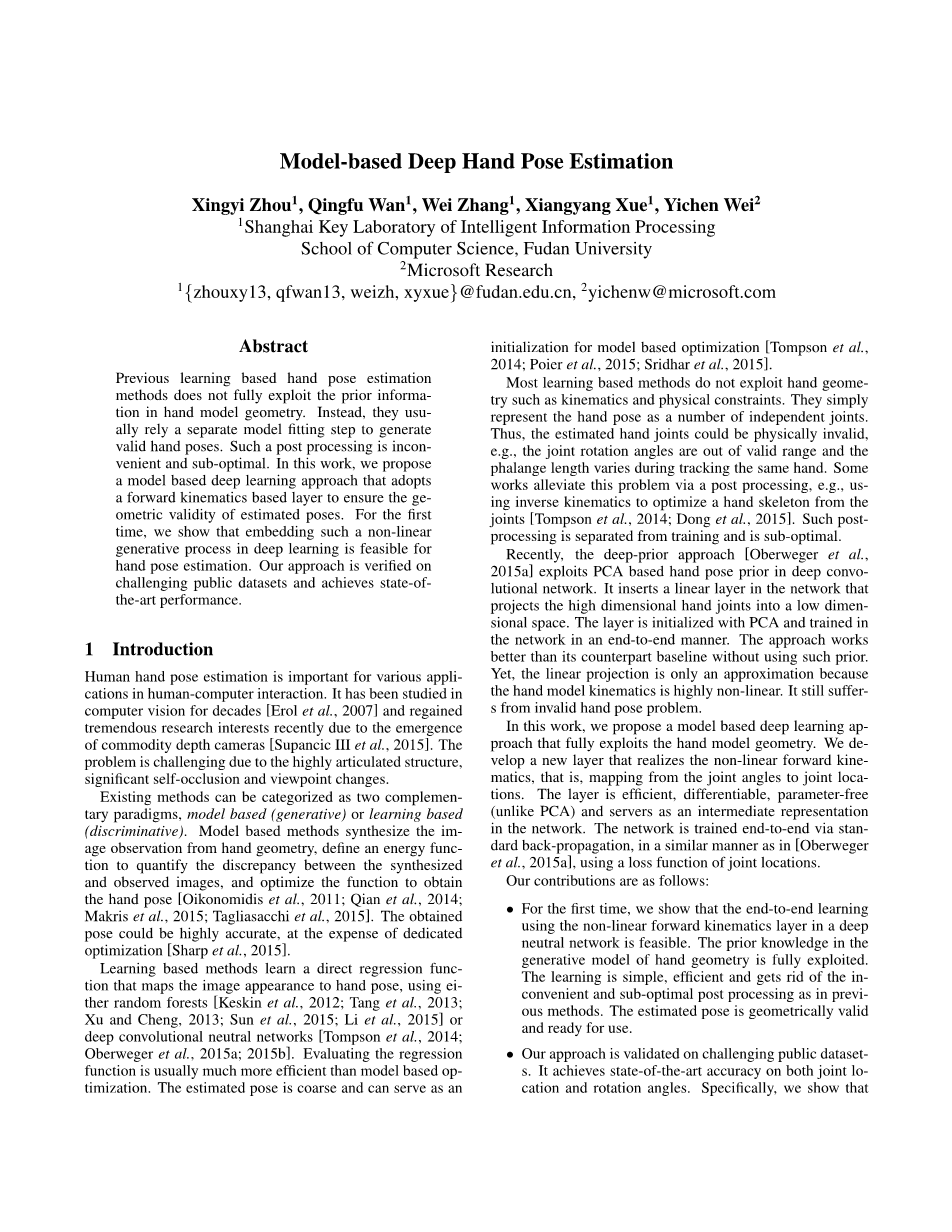 在这项工作中,我们提出了一种基于模型的深度学习方法,它充分利用了手模型几何。 我们开发了一个实现非线性正向运动学的新层,即从关节角度到关节位置的映射。该层非常高效,可区分,无参数(与PCA不同),并且在网络中以服务器作为中间表示。网络通过标准反向传播进行端到端的训练,其方式与[Oberweger et al.,2015a]类似,都使用关节位置的损失函数。