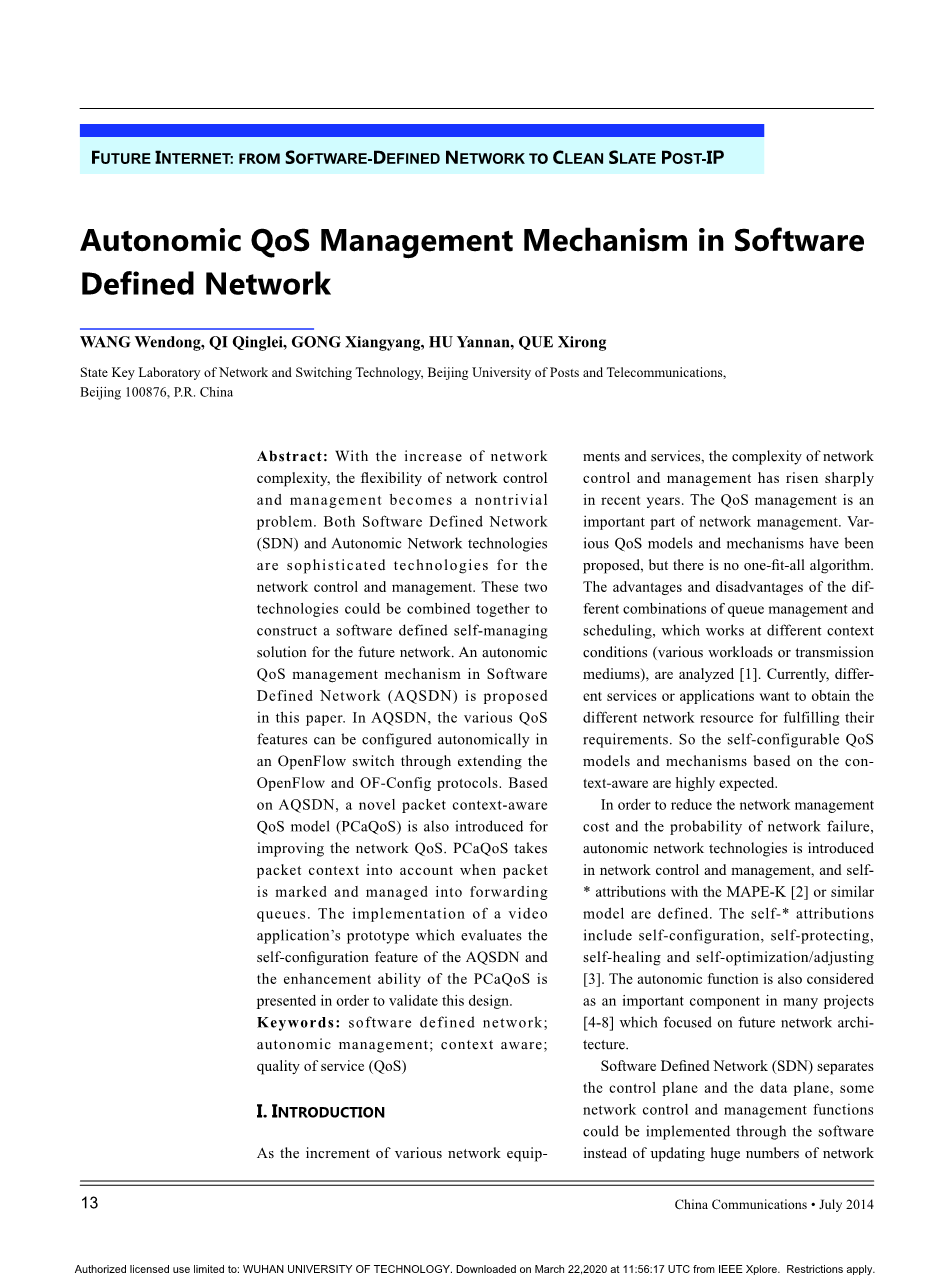 为了保证网络的服务质量,设计了一种SDN(AQSDN)中的自主服务质量管理机制。在这种机制中,控制者在自主控制回路中承担分析和决策的功能,而交换机则充当上下文的收集器和行为的执行器。该机制根据来自数据平面的上下文和来自操作者的策略自适应地控制QoS规则。此外,为了提高多媒体服务的质量,我们还提出了一种包上下文感知的QoS模型(PCaQoS),它根据包的语义优先级来处理包。