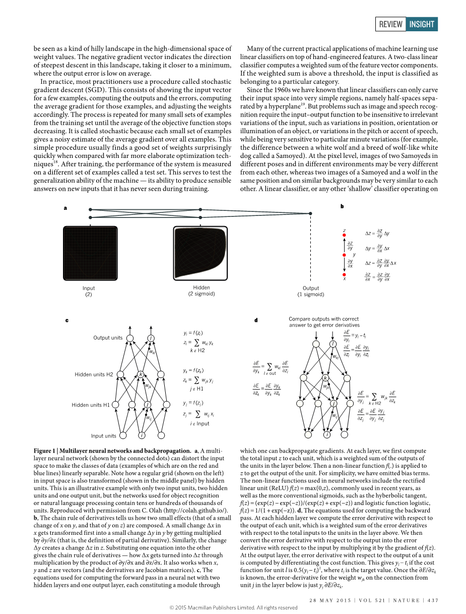 机器学习系统被用来识别图片中的目标,将语音转换成文本,匹配新闻元素,根据用户兴趣提供职位或产品,选择相关的搜索结果。逐渐地,这些应用使用一种叫深度学习的技术。传统的机器学习技术在处理未加工过的数据时,体现出来的能力是有限的。几十年来,想要构建一个模式识别系统或者机器学习系统,需要一个精致的引擎和相当专业的知识来设计一个特征提取器,把原始数据(如图像的像素值)转换成一个适当的内部特征表示或特征向量,子学习系统,通常是一个分类器,对输入的样本进行检测或分类。特征表示学习是一套给机器灌入原始数据,然后能自动发现需要进行检测和分类的表达的方法。深度学习就是一种特征学习方法,把原始数据通过一些简单的但是非线性的模型转变成为更高层次的,更加抽象的表达。通过足够多的转换的组合,非常复杂的函数也可以被学习。对于分类任务,高层次的表达能够强化输入数据的区分能力方面,同时削弱不相关因素。比如,一副图像的原始格式是一个像素数组,那么在第一层上的学习特征表达通常指的是在图像的特定位置和方向上有没有边的存在。第二层通常会根据那些边的某些排放而来检测图案,这时候会忽略掉一些边上的一些小的干扰。第三层或许会把那些图案进行组合,从而使其对应于熟悉目标的某部分。随后的一些层会将这些部分再组合,从而构成待检测目标。深度学习的核心方面是,上述各层的特征都不是利用人工工程来设计的,而是使用一种通用的学习过程从数据中学到的。