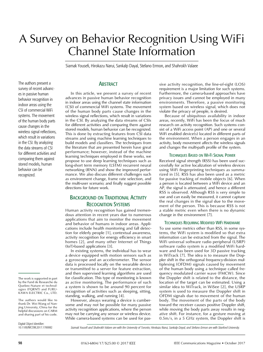 本文综述了利用商业WiFi系统的信道状态信息(CSI)进行室内人行为识别的研究进展。人体各部分的运动引起无线信号反射的变化,从而导致CSI的变化。通过分析不同活动的CSI数据流,并将其与存储的模型进行比较,从而可以识别出人类的行为。这是通过从CSI数据流中提取特征,并使用机器学习技术来构建模型和分类器来实现的。本文所介绍的技术具有很好的性能,但是,我们建议使用诸如长-短期记忆(LSTM)递归神经网络(RNN)等深度学习技术来代替这些工作中使用的机器学习技术,并显示出改进的性能。我们还讨论了环境变化、帧速率选择和多用户场景等不同的挑战,最后提出了未来工作的可能方向。