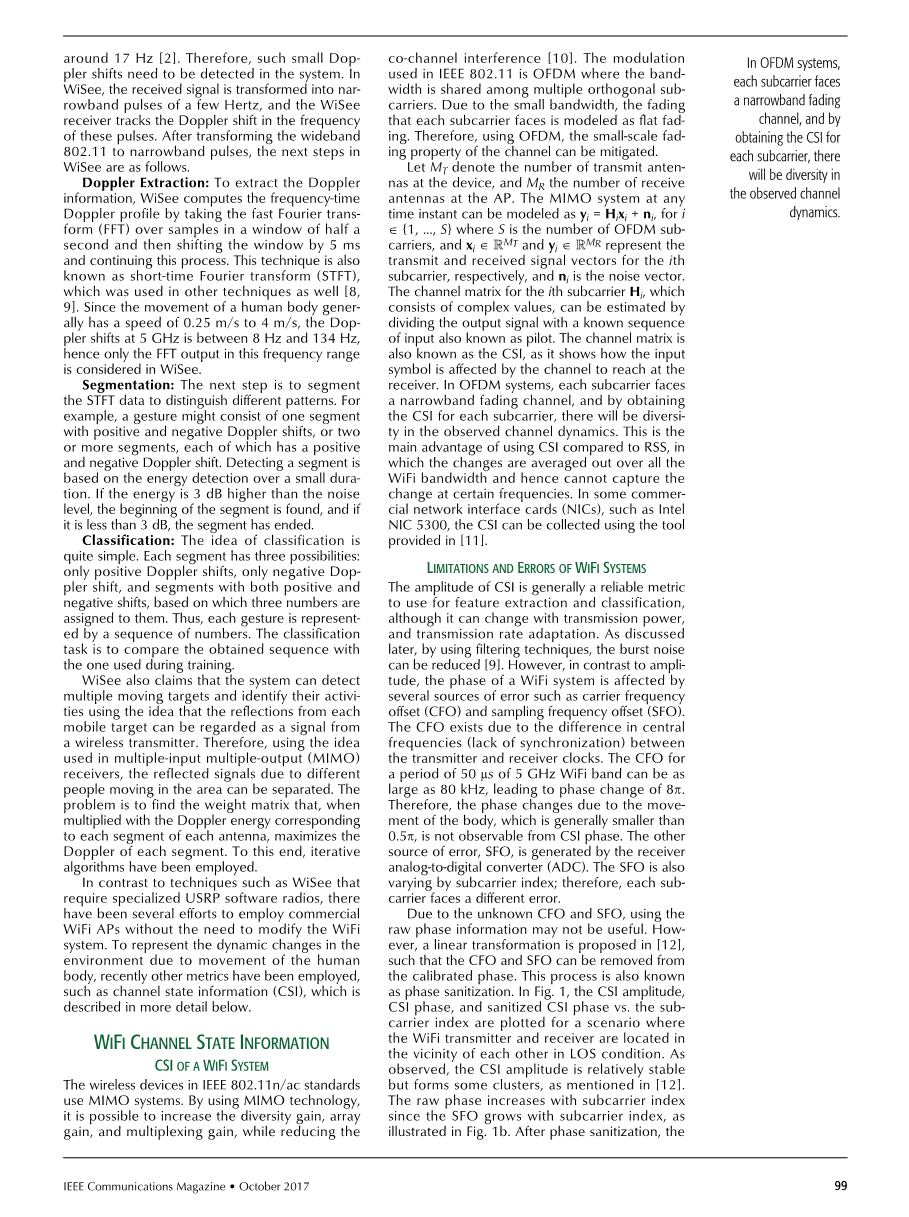 与Wise等需要专用USRP软件无线电的技术不同,这项技术已经有几项努力采用商业WiFi接入点,而无需修改WiFi系统。为了表示由于人体运动而引起的环境动态变化,现阶段还采用了其他指标,例如信道状态信息(CSI),下面将对其进行更详细的描述。