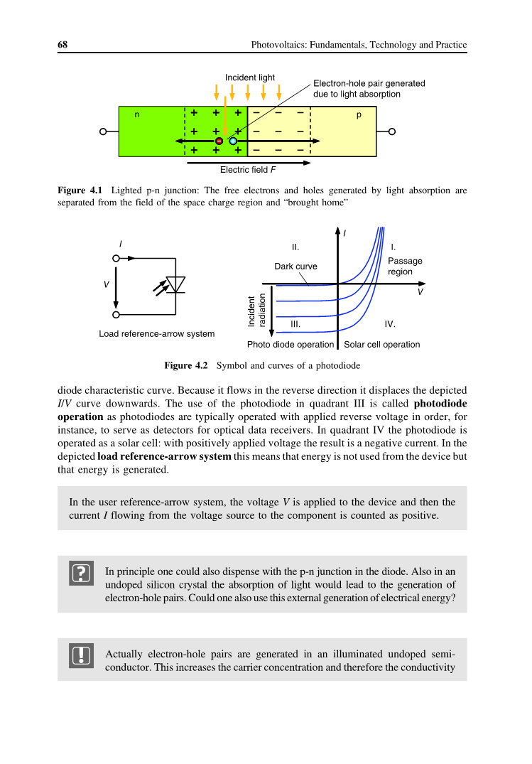 只要没有光照射在光电二极管上,它就可以视作是普通的p-n结。使用反向电压时,只有很小的反向电流流动,这种电流称为暗电流。一旦光线照射到二极管上,就会将与电压V无关的光电流添加到二极管特性曲线中。因为它沿相反方向流动,所以它使所示的I / V曲线向下移动。在第III象限中使用光电二极管称为光电二极管操作,因为光电二极管通常在施加的反向电压下运行,以便例如用作光学数据接收器的检测器。在第IV象限中,光电二极管用作太阳能电池:施加正电压后,结果为负电流。在如图4.2所示的负载参考箭头系统中不从设备使用能量,而是产生能量。