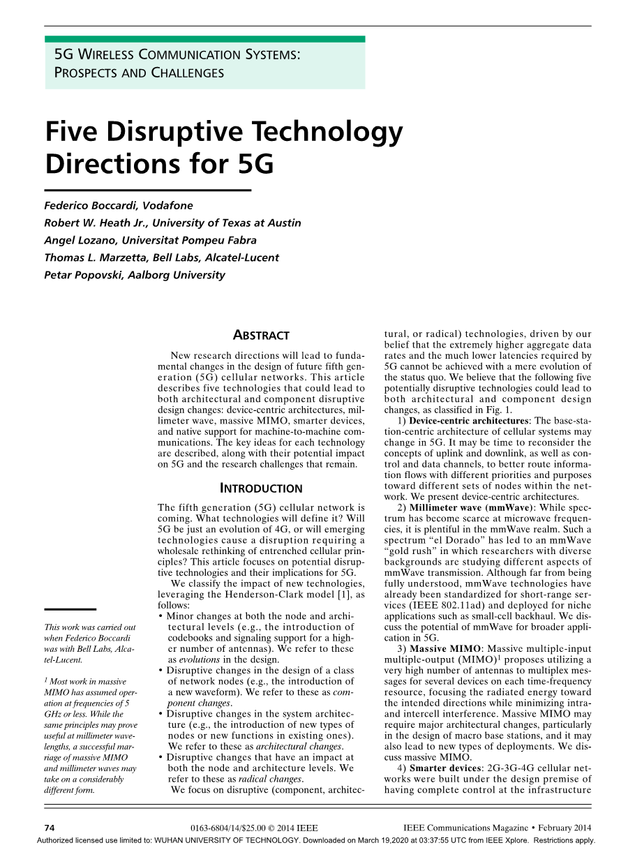 新的研究方向将导致未来第五代(5G)蜂窝网络设计的根本变化。本文描述了五种可能颠覆性地改变架构和组成部分设计的技术:以设备为中心的结构体系、毫米波、大规模MIMO、更智能的设备和对机器到机器通信的本机支持。本文描述了每种技术的关键思想,以及它们对5G的潜在影响和目前研究中面临的挑战。