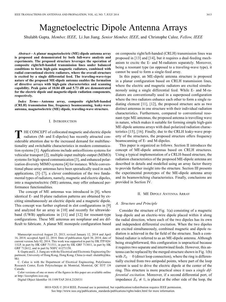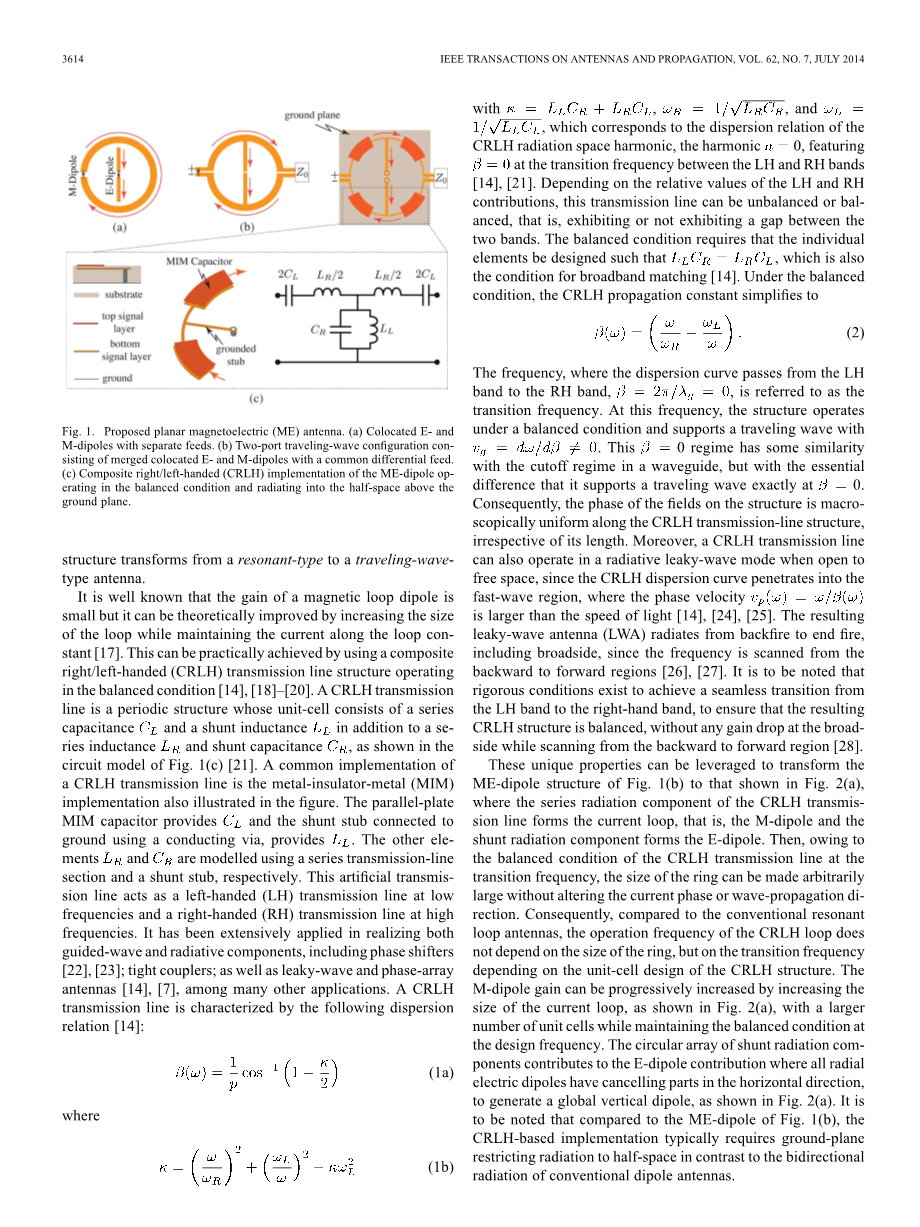 本文在基于CRLH传输线的平面配置提出了一个偶极子天线结构,其中电散热器兴奋同时使用唱同时和磁乐差分。虽然电子和散热器通常用于叠加的配置在两散热器互相加强,形成一个单一的类风湿性关节炎的饮食元素[11]、[12]、本文提出的结构作为一个结构和个体两个不同的天线的辐射特性。此外,相比传统的谐振型我的天线,该天线是波的性质,这使得它适合于形成简单的高增益我偶极天线阵列的双极化辐射特性[15],[16]。最后,由于CRLH的漏波结构,该结构提供了频率扫描E-偶极子和M-偶极子。