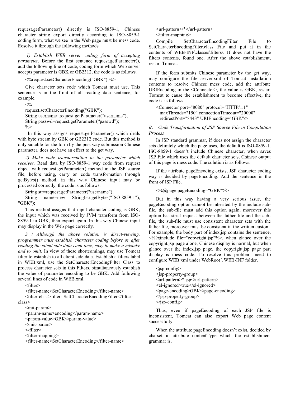 这种方法指定输入字符流编码是GBK,输入从JVM 虚拟机对ISO-8859-1到GBK编码转换中取得,紧接着就又输出。通过这种方法中文输入可能正确展示在网页上。