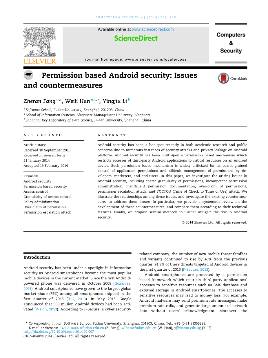 近来安卓安全在学术研究和公众关注中都是热点问题,因为在安卓平台上出现很多安全攻击和隐私泄露的问题。安卓安全是根据基于限制第三方安卓软件访问系统关键资源的机制来设置权限。基于这样的许可机制,由于它难以控制的许可权限和权限管理上的困难,被开发者,市场专员和终端用户所摒弃。在这篇文章中我们研究在安卓安全中出现的问题,包括粗粒度权限,不够格的权限管理,不充足的权限文档,权限的过分要求,权限增加导致的攻击和TOCTOU攻击。我们列出这些问题之间的关系,并且调查目前处理这些问题的措施。而且我们对这些措施的提高做了系统的回顾并且根据它们技术上的特征做了对比。最后我们提出了几种可以降低安卓安全的风险。