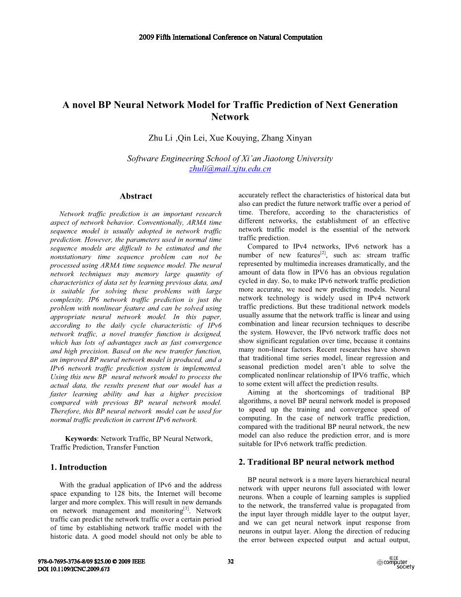 相比于IPv4网络,IPv6网络具有许多新功能[ 2 ],如:以多媒体为代表的流通信急剧增加,和在IPv6中的数据流量的数量具有明显的规律循环。因此,为了使IPv6网络流量预测更准确,我们需要新的预测模型。神经网络技术的广泛使用在IPv4网络的流量预测中。但这些传统的网络模型通常假定网络流量是线性的并且使用组合和线性递归技术来描述系统。然而,IPv6网络流量不随着时间的推移显示显著的规律,因为它包含许多非线性因素。最近的研究显示传统时间序列模型,线性回归和季节性预测模型不能解决IPv6流量的复杂的非线性关系,这在一定程度上影响预测结果。