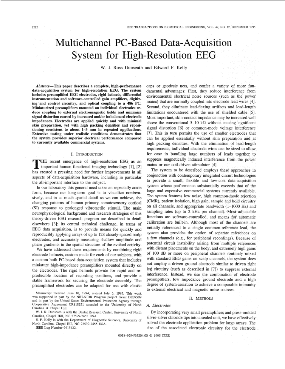我们已经通过将对于我们每一个受试者定制的刚性电极头盔和包括直接安装在电极上的微型高电阻前置放大器的定制的基于PC的数据采集系统结合起来来解决这些需求。这个刚性头盔已经提供了用于记录位置的快速并可重复的定位,并提供一个稳定的框架用于固定电极组件。放大电极可用于弹性帽或测网,并赋予各种更基本的优点:首先,减少通常连接到电极导线的来自环境电噪声源(如电源线)的干扰。其次,他们利用屏蔽电缆排除所遇到的引线弯曲工件和消除引线长度的限制。最重要的是,皮肤接触阻抗可以增加远高于常规5-10 kOmega;而不引起显著的信号失真或共模电压干扰。这反过来又允许使用基本上没有应用皮肤的准备和在高包装密度的较小的电极。随着消除引线长度的要求,个别电极导线可以调整大小以允许轻松地捆绑大量的引线在一起,以抑制来自电源或线圈驱动的刺激的磁感应干扰。