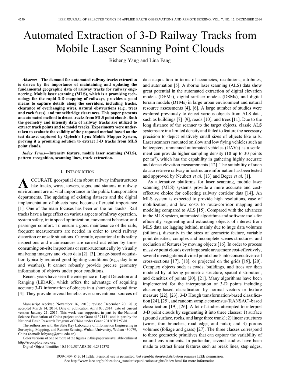关键词:强度特性、移动激光扫描(MLS)、模式识别、扫描路线、轨道提取