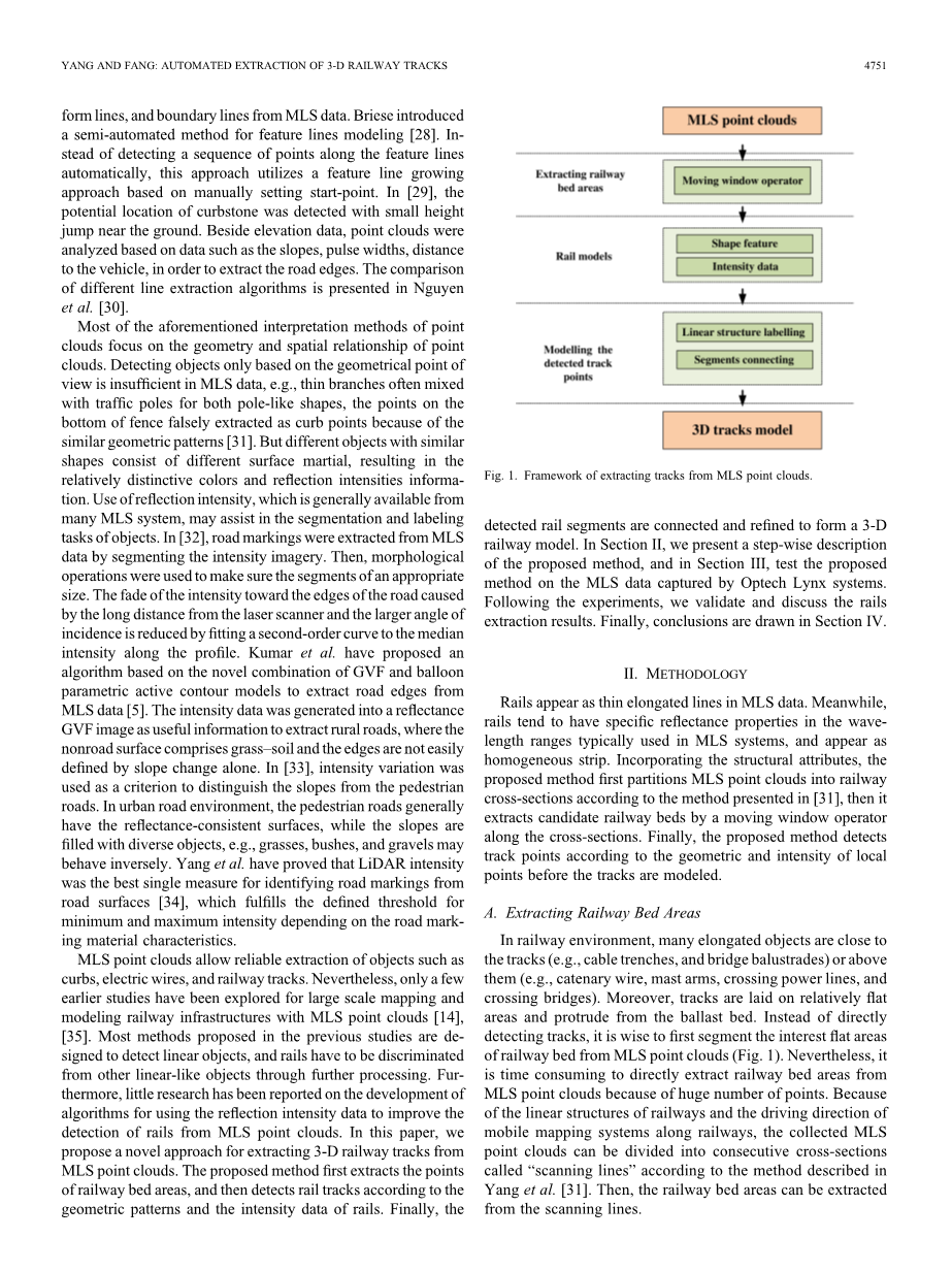 MLS点云允许可靠地对象如萃取、电线和铁路。然而,只有很少早期的研究已经探索了大规模映射和铁路基础设施用MLS点云建模[14]、[35]。大多数先前的研究方法都是为了检测线性对象和铁路已经通过处理从其他类似线性物体区别开。此外,一些研究已经报道了使用了反射强度数据来提高从MLS点云中检测铁轨的算法的发展。本文,我们提出了一种新颖的从MLS点云中提取三维铁路轨道的方法。提出的这个方法首先提取铁路床区域的点;然后根据几个图案和铁路数据的强度数据检测了铁路轨道;最后,检测了的铁轨段被连接和重新定义来形成一个三维铁路模型。在第二章节,我们展现了提出方法的渐进的描叙;在第三章节,在Optech Lynx系统上获取的MLS数据上测试提出的方法。接下来实验,我们验证和讨论提出结果;最厚,在第四节得到结论。