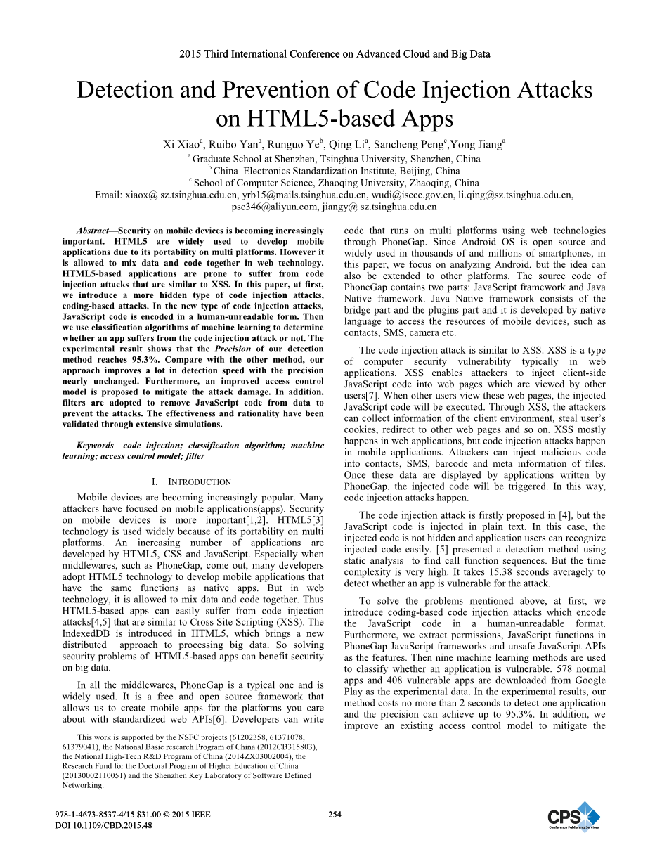 015第三届先进云计算和大数据国际会议 发现与阻止针对HTML5应用程序的代码注入攻击外文翻译资料