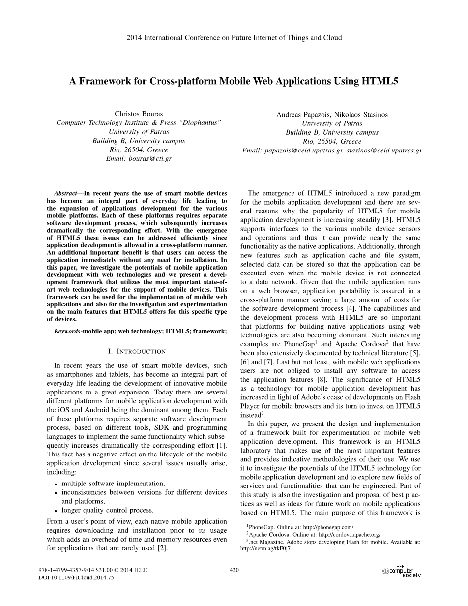 在本文中,我们提出一个框架的设计与实现,该框架用来构建在移动网络应用开发的实验。这个框架是一个HTML5实验室,它充分利用了最重要的特征并提供了它们使用的指示的方法。 我们用它来探讨HTML5技术在移动应用开发方面的潜力,并且探索可被工程化的服务和功能的新领域。部分研究也是最佳时间的调查和建议也是基于HTML5针对未来的移动应用程序工作上的想法。这个框架的主要目的是为用户提供简单且易于实现的在跨平台方面的HTML5功能。 大多数该框架的特点是一个现代化的移动至关重要应用。他们利用信息设备可以提供并还具有如社交网络互动并在云中的数据呈现。应当指出的该演示的功能应用框架是公开可用的要使用由感兴趣的研究人员或网络工程师。此外,该应用程序的功能在示例视频中简要论证为此目的创建和正在使用我们的网站。
