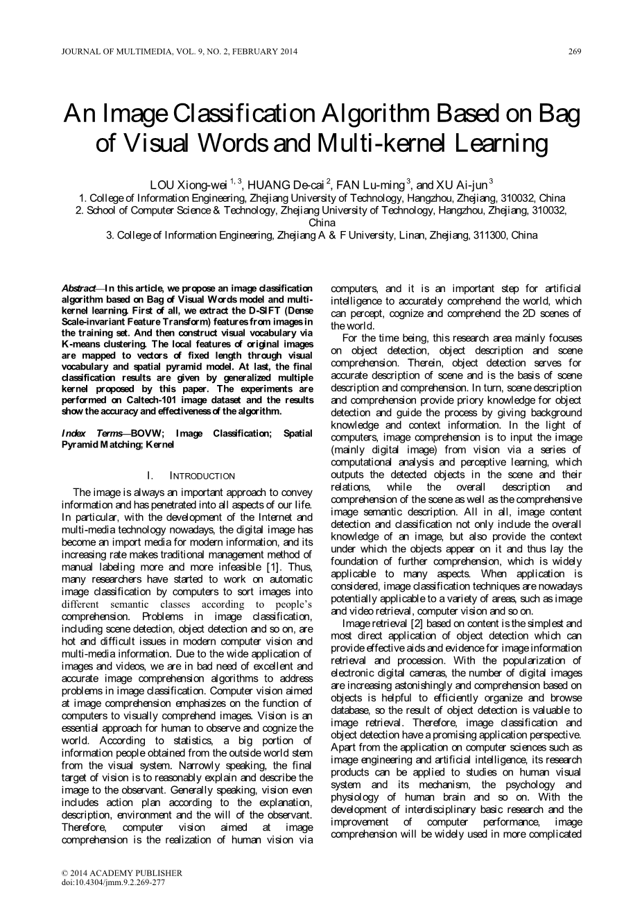 随着支持向量机理论的发展,对核方法的关注越来越受到重视。用非线性模式分析中来解决问题是一种有效的方法。然而,单一的核函数往往不能满足复杂的应用需求,例如图像分类和目标识别。这也证明了多核模型的性能优于单一内核模型或它们的组合。多核模型是一种更加灵活的基于学习的核函数。本文提出了一种用于图像分类的加权多核函数。由于加权多核学习方法,核函数参数可以根据不同类别的图像更好的调整,并且单一的BoVW直方图可以由视觉单词金字塔直方图取代(PHOW),这增加了区分空间分布对前者的能力。在这篇文章中,我们研究了在图像分类和物体识别领域中流行的算法,并提出了一种基于BoVW模型和多核函数的图像分类算法。在特征提取方面,我们采用比传统的方法更高效的D-SIFT算法。对于特征编码,我们采用了字模型和空间金字塔模型,这是在这个领域最先进的方法。对于分类器,我们是第一个提出了加权多核函数。此函数比那些基于支持向量机(SVM)分类器之间的多核学习算法更好。我们将通过实验证明了本文方法的有效性。