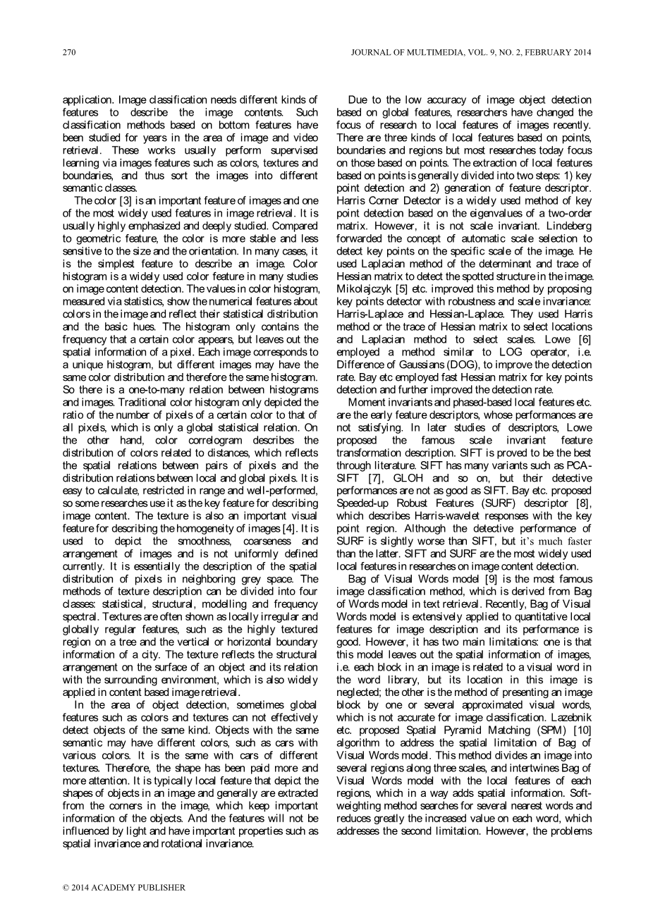 由于基于全局特征的图像目标检测精度较低,近年来,研究者对图像局部特征的研究重点已经改变了,局部特征有基于点、边界和区域三种,但目前大多数研究集中在基于点的局部特征。基于点的局部特征的提取一般分为两个步骤:1)关键点检测和2)特征描述子的生成。Harris角点检测是一种广泛使用的方法,它是基于一个二阶矩阵的特征值的。但是,它并不具有尺度不变性。林德伯格促进了自动尺度选择的概念来检测图像的具体尺度的关键点。他用行列式的拉普拉斯算子方法和Hessian矩阵的迹的方法来检测图像中的斑点状构造。Mikolajczyk 等人改进了这个方法,提出了具有鲁棒性和尺度不变性关键点检测的方法: Harris-Laplace和Hessian-Laplace。他们用Harris法或Hessian矩阵的迹方法选择位置和拉普拉斯方法选择尺度。Lowe所采用的方法类似于LOG算子,即高斯差(DOG),提高了检测率。Bay等人采用了快速Hessian矩阵的关键点检测,进一步提高了检测率。