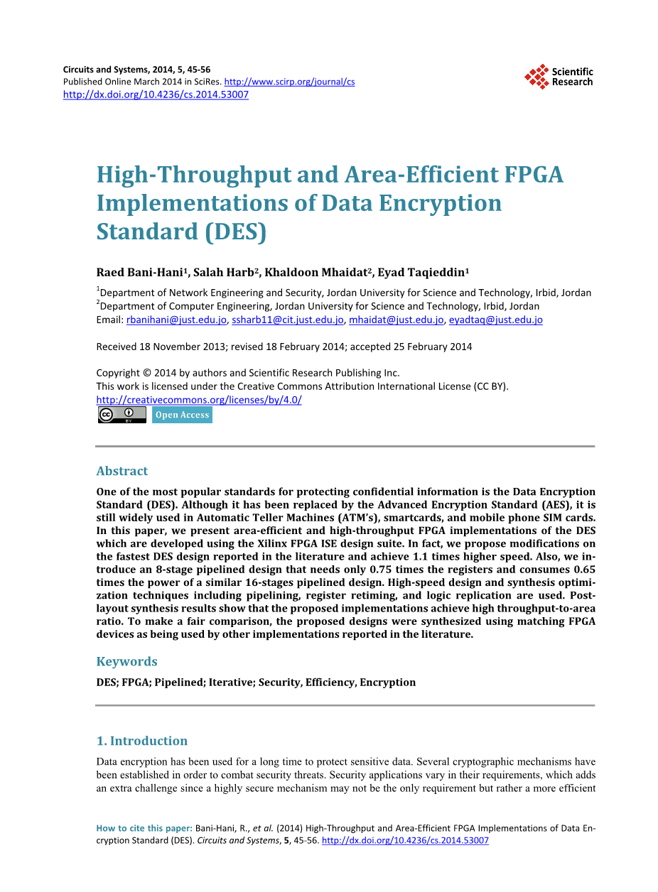 在本文中,对DES算法的有效实现(的吞吐量和地区)使用FPGA提出了。我们使用的是Xilinx公司的FPGA的可重构硬件平台。介绍了DES算法的不同实现方法:迭代,16级流水线,8级流水线,48级流水线。提出的8级方案不违反原来的16轮标准,而是结合两轮在一个阶段,以节省面积和功率,这是最需要在广泛的应用领域,如无线传感器网络(无线传感器网络)。