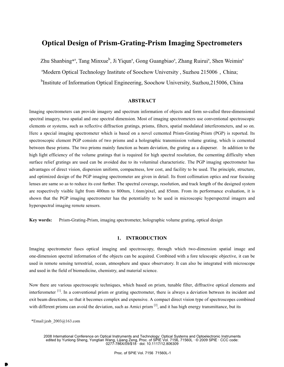 目前存在各种各样的光谱技术,它们都是基于棱镜、滤光片、衍射光学元件、干涉仪等分光方法。在传统的棱镜或光栅光谱仪中,,往往存在一个偏向角问题,即入射光束和出射光束不在同一条轴线上。这样构成的系统属典型的离轴系统,存在着体积大、装调困难、稳定性差等缺陷。采用不同的棱镜组合可以做成直视的分光器件,如阿米西棱镜,其有更高的能量透过率,但是单纯用棱镜组合的直视型分光器件色散是非均匀的,而采用棱镜和光栅组合(Grism)而成的直视型分光器,可以得到比较均匀的色散。
