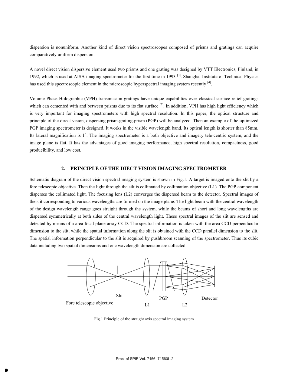 PGP棱镜分光器件的结构如图2, 它包括两个棱镜的与棱镜之间的一个胶结光栅。体积光栅全息刻录在重铬酸盐明胶胶片的平面玻璃基板上。一个平面玻璃覆盖在光栅上,用于防止刻录的光栅潮湿。准直入射光光在棱镜L1表面上发生折射,接着在光栅发生衍射,光栅的衍射与色散发生在第一级中。在棱镜L2表面上折射的光束和偏转分散束,通过棱镜L2该中心波长的光的出射方向仍然是在光轴上。