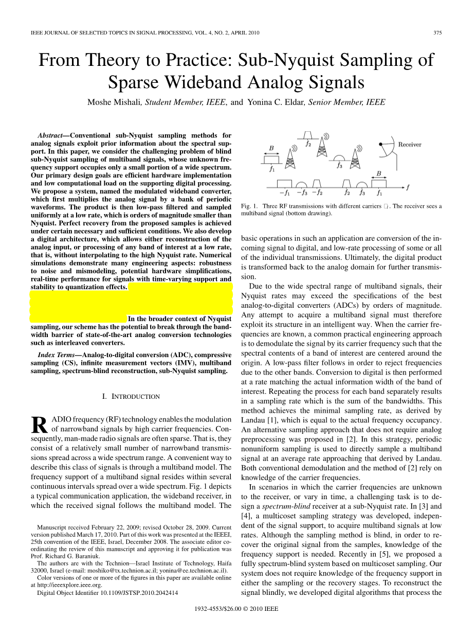 摘要—模拟信号常规的亚奈奎斯特抽样方法利用光谱支持的先验信息。在本文中,我们考虑了多频带信号的盲亚奈奎斯特采样的难题,其未知频率支持只占一整个个宽频谱的一小部分。我们的主要设计目标是能完成高效的硬件实现和数字化处理上的低计算量。我们提出了一个系统,命名为调制宽带转换器,其首先由一堆周期性波形产生模拟信号,然后通过低通滤波并以低的速率实现均匀采样,采样速率的数量级要小于奈奎斯特速率。从提出的样品中完美的恢复信号在一定的充分必要条件下是可以实现的。我们也开发了一种数字结构,它允许重建模拟输入并以低速率处理任何带宽,不需要内插到高奈奎斯特速率。数值模拟论证了许多工程方面:噪声和误建模的鲁棒性,潜在的硬件简化可能,实时性能的时变支持和量化效果的稳定性。将我们的系统和两个之前的方法相比较:带宽被现有的硬件设备限制的期性非均匀采样,它被限制为离散多频信号和高的计算负荷限制的随机解调器。