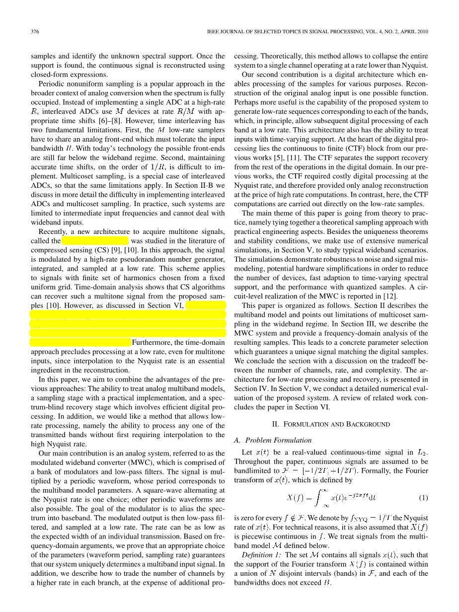 周期性非均匀采样是在模拟转换的大背景下频谱被完全占用时的一个流行方法。不同于在一个高速率下执行单个ADC,交错的ADC在速率为和适当的时间位移[6] - [8]下使用设备。然而,时间交错有两个基本限制。首先,低速率采样器必须共享一个容纳输入带宽的模拟前端。在今天的技术下可能的前端仍远远低于宽带制度。第二,保持准确时间的变化,按照的顺序,是难以实现的。多陪集采样,是交错ADC的一个特例,使得相同的限制依然适用。在第二节-B部分,我们详细讨论了实施交错ADC和多陪取样难度。实际上,这样的系统被限制为中间输入频率并且不能处理宽带输入。