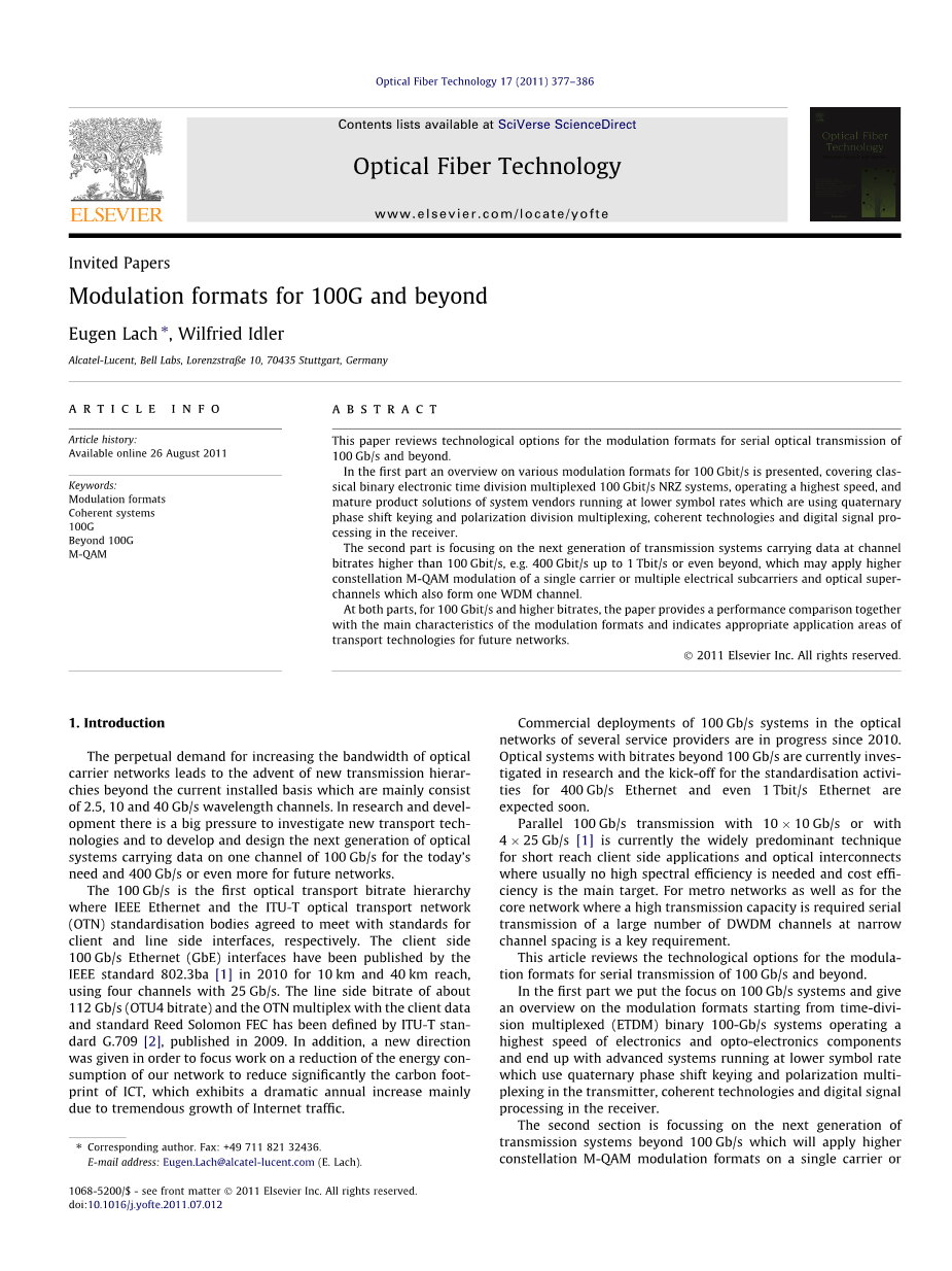 本文进行了关于串行传输的100Gb/s与超100Gb/s的调制格式的技术性分析。