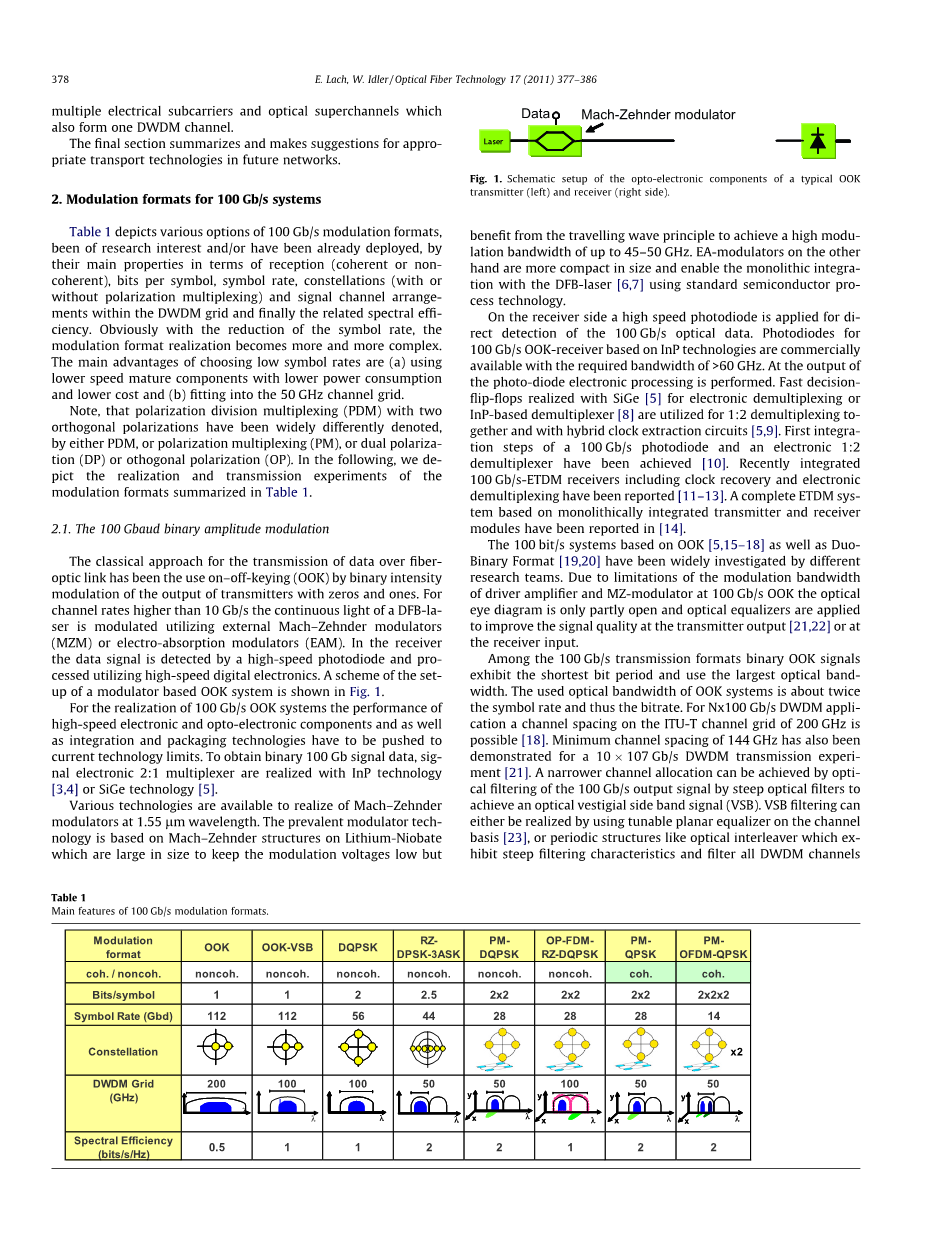 不同的研究小组研究了,基于OOK [5,15–18]与Duo-Binary格式的100 bit/s系统。由于驱动放大器与MZ调制器在100Gb/s OOK系统中调制带宽的局限,光眼图只能部分张开,需要使用光均衡器提高发射机输出信号的质量[21,22],或接收机的输入质量。