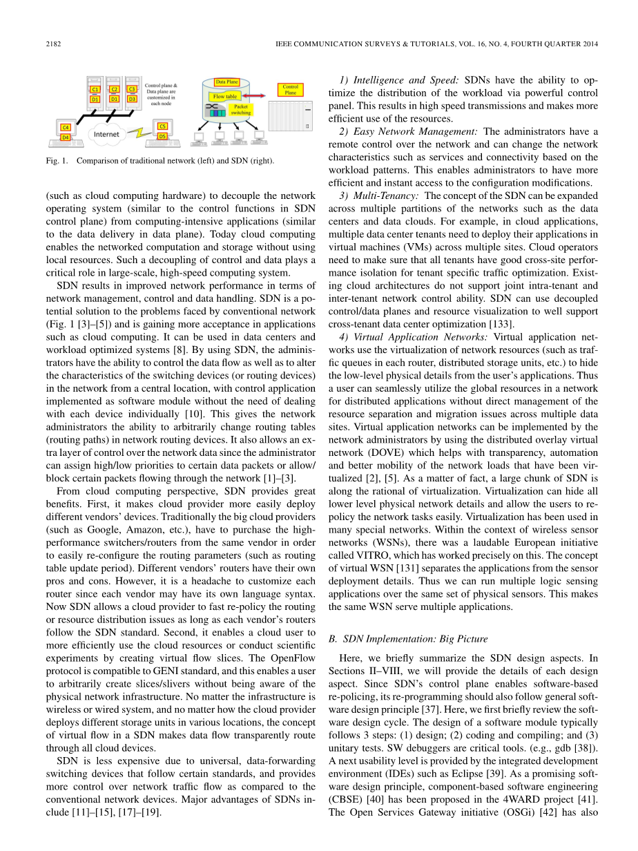 SDN并不是一个全新的概念。事实上,几十年前人们就可以使用某些基础设施(比如云计算硬件)从计算密集型应用(类似SDN数据平面的数据发送)来解耦网络操作系统(类似于SDN网络控制平面的控制功能)。当前,云计算能够使网络计算和存储不使用本地资源。这种控制层与数据层分离的工作模式在大规模、高速计算系统中起着关键性作用。