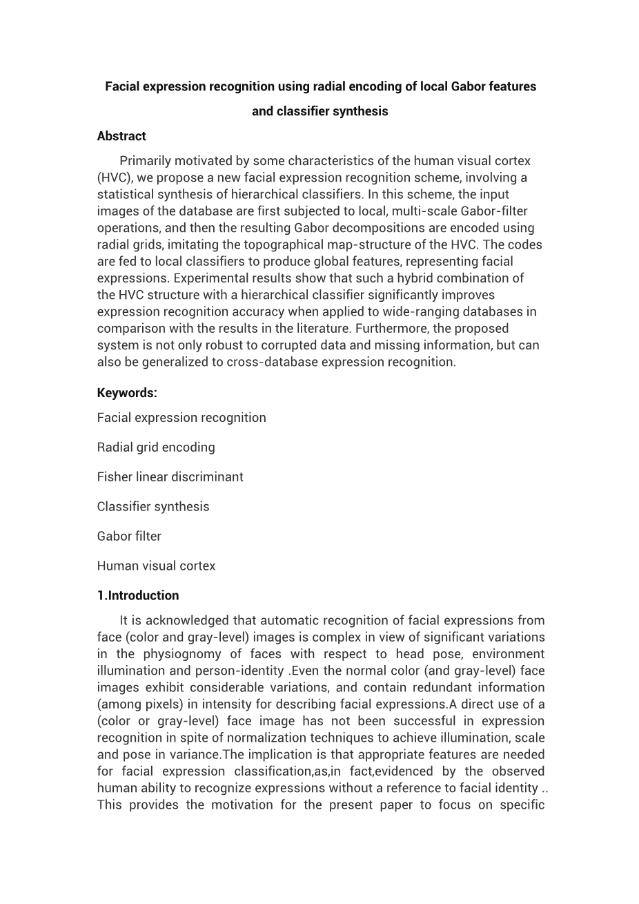在本文中,基于初级视映射,我们扩展了Gabor输出的径向编码策略,并获得了代表面部表情的显著局部特征。随后我们提出了一个面部表情识别系统,这是一个综合了一些人的视觉皮层(HCV)和分层分类器统计综合特征的组合系统。在这个方案中,局部特征首先通过对局部路径上的Gabor滤波器的输出编码获得。然后,应用主成分分析(PCA)和Fisher线性判别(FLD)分析编码的特点,将输出送入局部分类器。后者的输出,依次连接形成全局中级特征,这些特征在下一级经过PCA和FLD投影提取重要的信息,使得全局分类器进行分类。