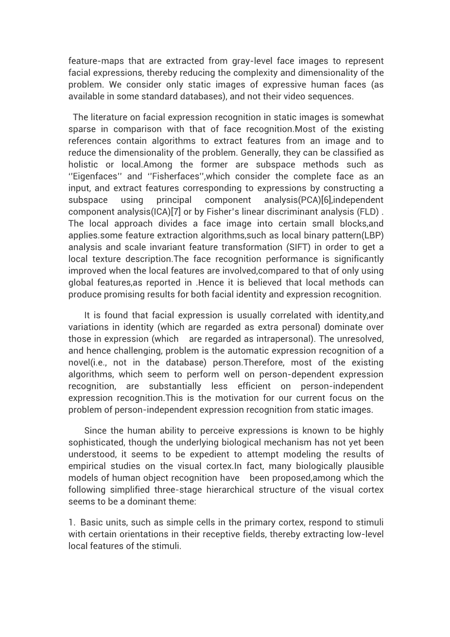 关于静态图像面部表情识别的文献与关于人脸识别的资料相比较少。大多数现有的参考文献中包含的算法都是从图像中提取的特征,并减少问题的维数。总的来说,它们可以被分类为整体的和局部的特征。前者是子空间方法,如eigenfaces”和“fisherfaces”,它们将完整的人脸作为输入,提取相应的特征表情,采用主成分分析(PCA),独立成分分析(ICA)或Fisher线性判别分析(FLD)的方法构建空间。局部方法将人脸图像分割成若干块,并应用一些特征提取算法,如局部二进制模式(LBP)和尺度不变特征变换(SIFT)分析,以获得一个对局部纹理的描述信息。研究表明,与仅仅使用全局特征相比,当使用到局部特征时,人脸识别性能有明显改善。因此可以相信,局部方法可对面部身份确认和表情识别产生更好的效果。