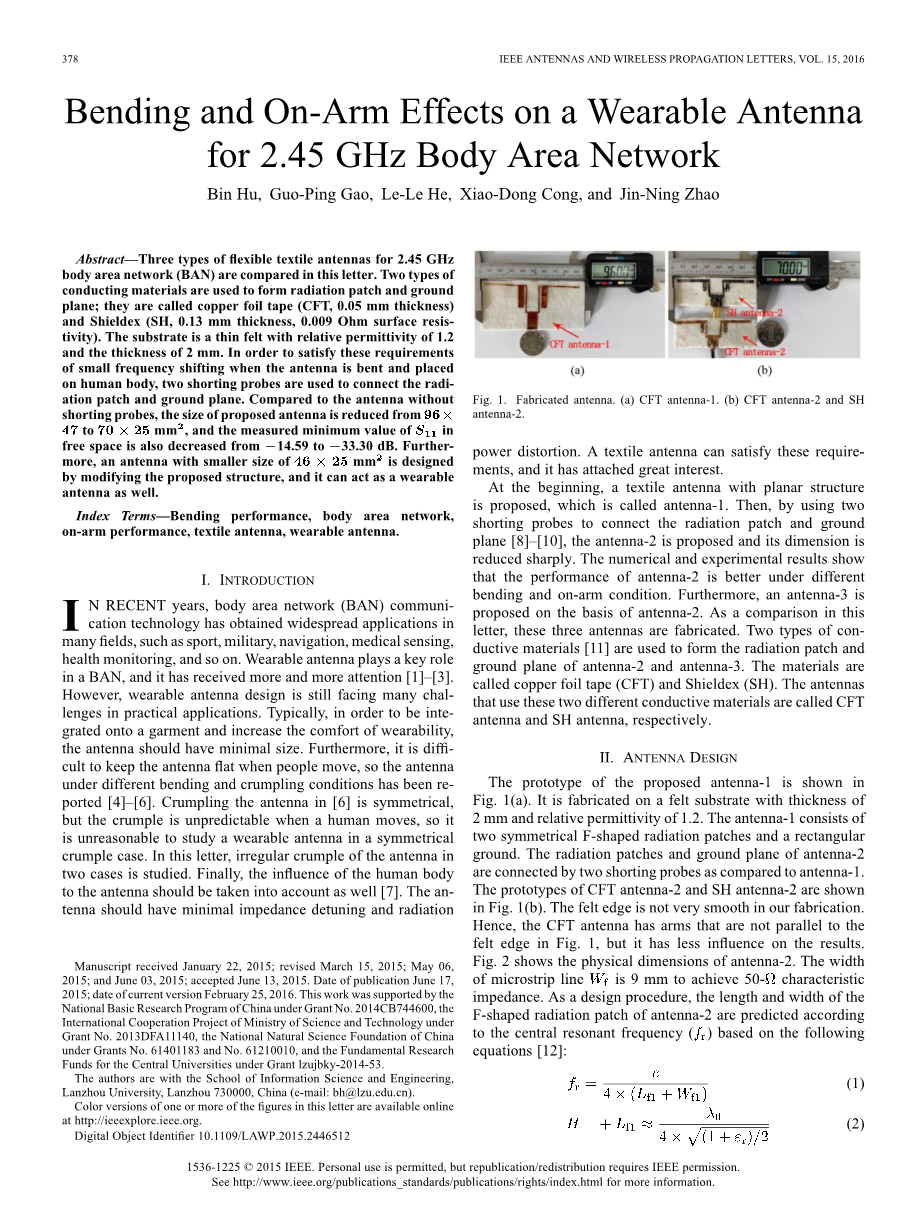 首先,提出了一种平面结构织物天线,即天线-1。然后,通过使用两个短路探针连接辐射贴片和接地平面,提出了天线-2且其尺寸大幅降低。数值模拟和实验结果表明,天线-2在不同的弯曲和人体运动条件下性能表现更好。此外,在天线-2的基础上提出了天线-3。作为本论文中的比较组,这三个天线都是仿真的。天线-2和天线-3分别使用两种用于形成辐射贴片和接地平面的导电材料制作,这些材料叫做铜箔胶带(CFT)和Shieldex(SH)。使用这两种不同导电材料的天线分别被称为CFT天线和SH天线。