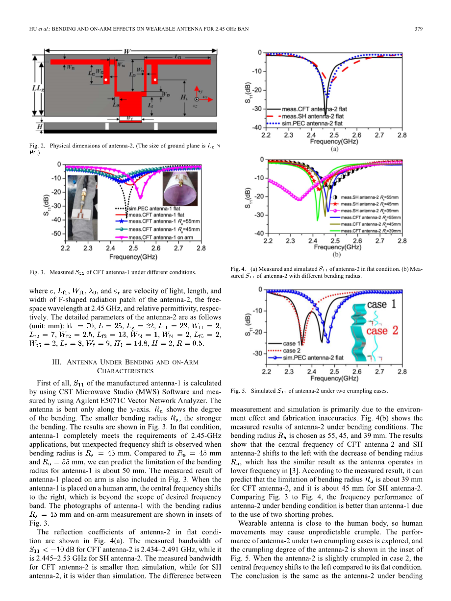 因为可穿戴天线贴近人体,所以人的运动可能导致挤不可预知的褶皱。我们对天线-2在两种褶皱情况下的性能进行了探讨,并将天线-2褶皱程度在图5中展示了出来。当天线-2在情况2中产生轻微褶皱时,中心频率相较于它的水平状态左移。得出的结论与天线-2弯曲状态下所得结论相同。如果像第一种情况下在天线-2上产生更严重的褶皱,频率特性将变得更差,但如果将天线放置于手臂或人体上的平坦部位,将减小褶皱对天线产生的影响。