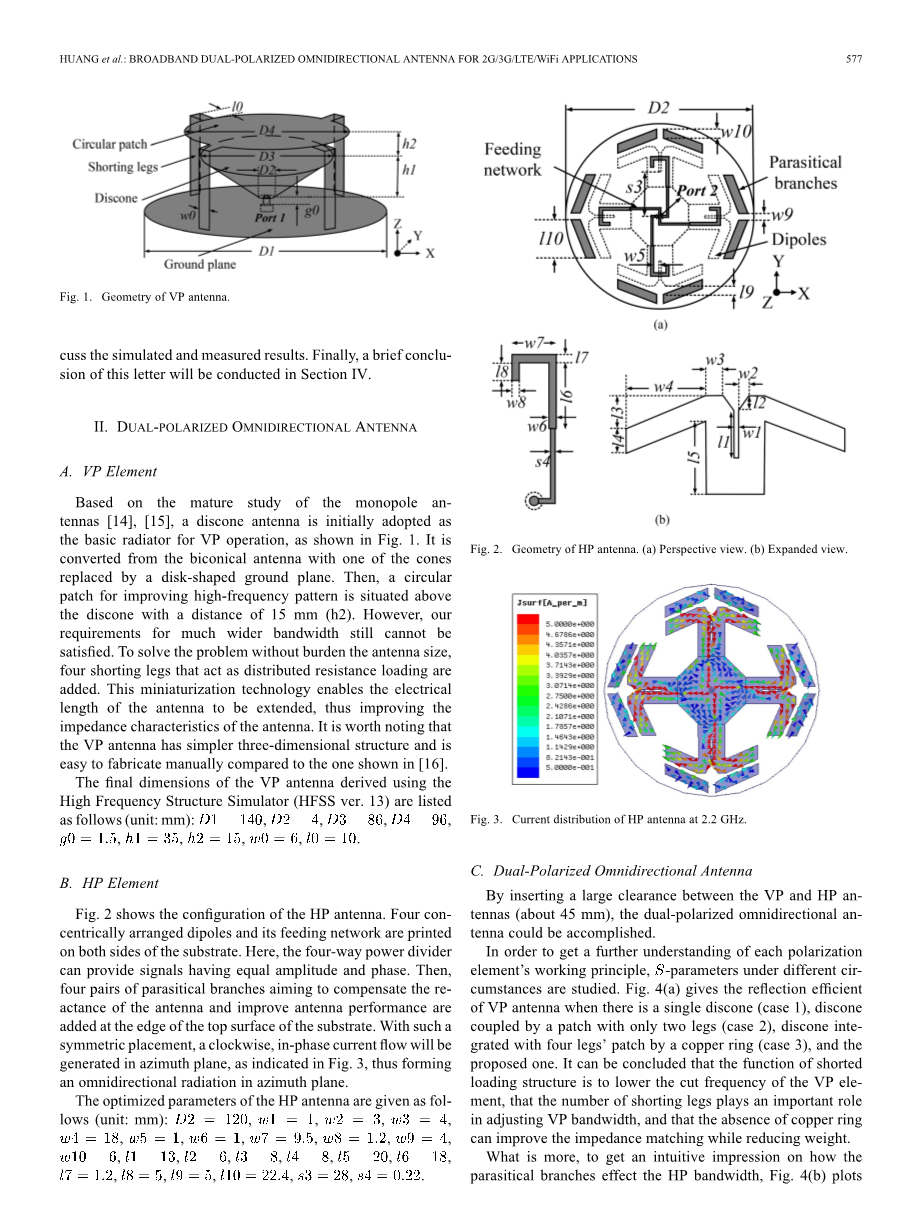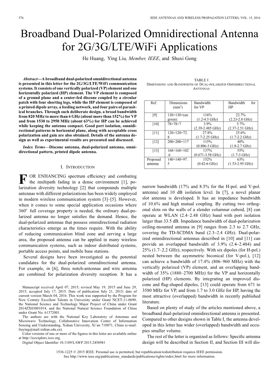 基于对上述文章的大量研究,提出了宽带双极化全向天线。与表I中所示的其他设计相比,本文中开发的天线具有更宽的(重叠的)带宽,并且占用更小的体积。