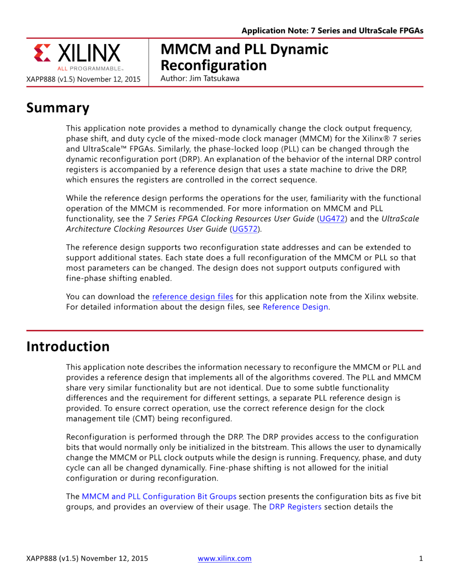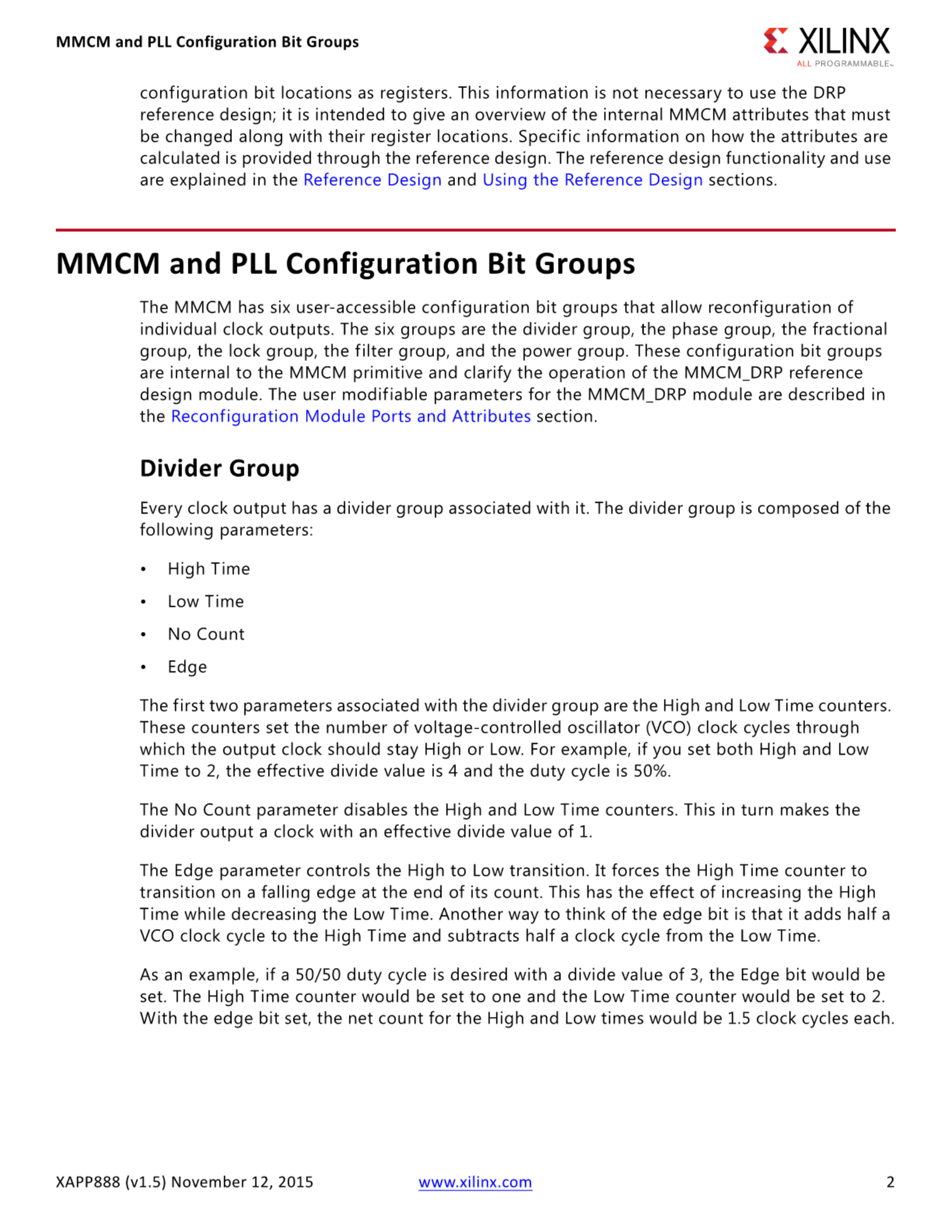 MMCM和PLL配置位组分段将配置位作为五位组,并提供了其使用概况。注册部门详细信息, 所有可编程位定位为寄存器。此信息不需要使用DRP参考设计;它被要求提供一个内部MMCM特性概览,该特性必须随着注册位置的变化而改变。通过参考设计提供了关于如何计算属性的具体信息。参照设计的功能性和使用性在参照设计中得到了解释,并使用了参照设计部分。