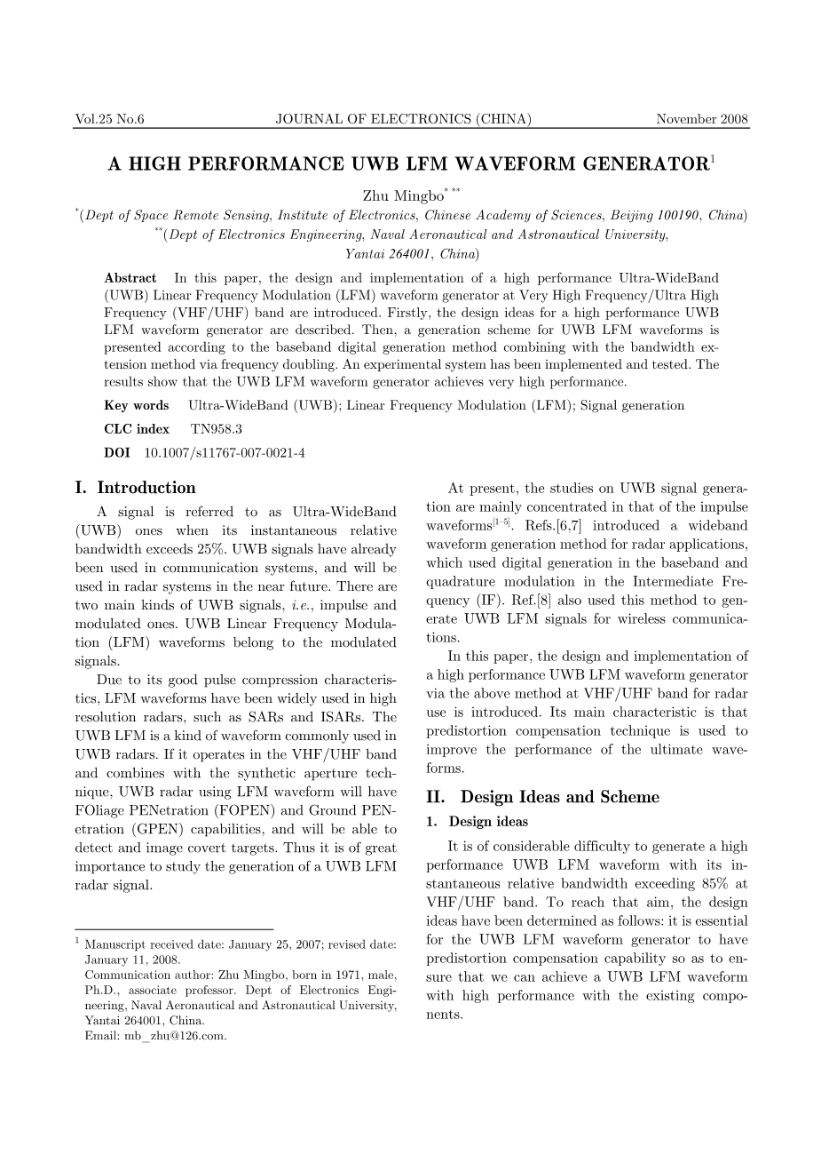 本文的设计与实现高性能UWB LFM波形发生器通过上述方法在VHF / UHF频段进行雷达使用是介绍。 它的主要特点是预失真补偿技术用于改善最终波形的表现。