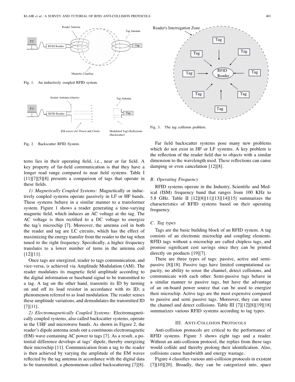 本文的其余部分安排如下。 我们首先回顾RFID技术,并根据第二部分的操作原理进行比较。 之后,我们分别在第III-A和III-B部分中对Aloha和基于树的协议进行了全面的调查和比较。 在第III-C节,我们调查了五个混合标签阅读协议。 接下来是第四部分对现行RFID标准的回顾。 接下来,在第五节中,我们提出了涉及无线传感器的新兴RFID系统中的问题。 第六节结束本文。