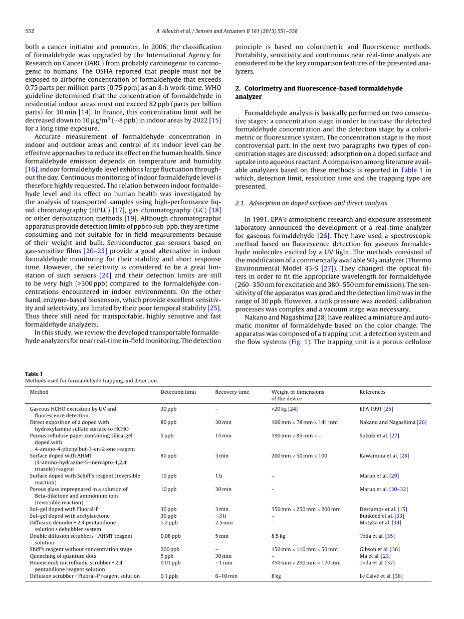 甲醛分析基本上在两个连续阶段进行:一个浓度阶段,由比色或荧光系统以增加检测甲醛浓度和检测阶段。 集中阶段有最多争议的部分。在接下来的两段中讨论了两种类型的浓度级:在掺杂表面上的吸附和吸收到水性反应物中。基于这些方法可用分析仪之间的比较报告见表1中。其中包括,检测限,分辨率时间和捕获类型呈现。
