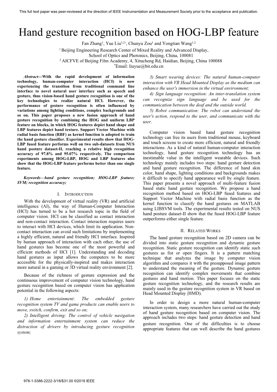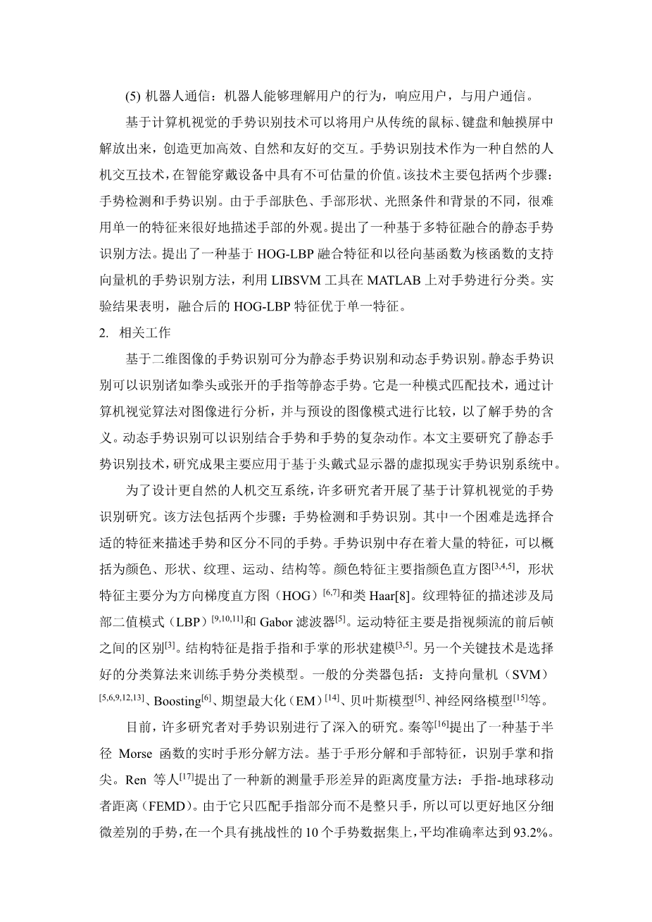 基于HOG-LBP特征的手势识别外文翻译资料 2023-01-15 16:06:00 英语原文共 6 页,剩余内容已隐藏,支付完成后下载完整资料 英语译文共 14 页,剩余内容已隐藏,支付完成后下载完整资料 资料编号:[239758],资料为PDF文档或Word文档,PDF文档可免费转换为Word 原文和译文剩余内容已隐藏,您需要先支付 30元 才能查看原文和译文全部内容!立即支付 发小红书推广免费获取该资料资格。点击链接进入获取推广文案即可: Ai一键组稿 | 降AI率 | 降重复率 | 论文一键排版 PREVIOUS NEXT 您可能感兴趣的文章 看边界:边界感知面部对齐算外文翻译资料 看边界:边界感知面部对齐算外文翻译资料 一种支持分布式正态智能监控的多代理体系结构外文翻译资料 增强的无线局域网协作MAC外文翻译资料 近眼显示器的绝对辐射和光度测量外文翻译资料 红外遥控系统外文翻译资料 一幅单一图像中雨滴去除的专注生成对抗性网络外文翻译资料 深度残差学习在图像识别中的应用外文翻译资料 低成本,便携式室内环境质量监测装置的设计与开发外文翻译资料 使用基于查询蓝牙的RSSI概率分布进行室内定位外文翻译资料