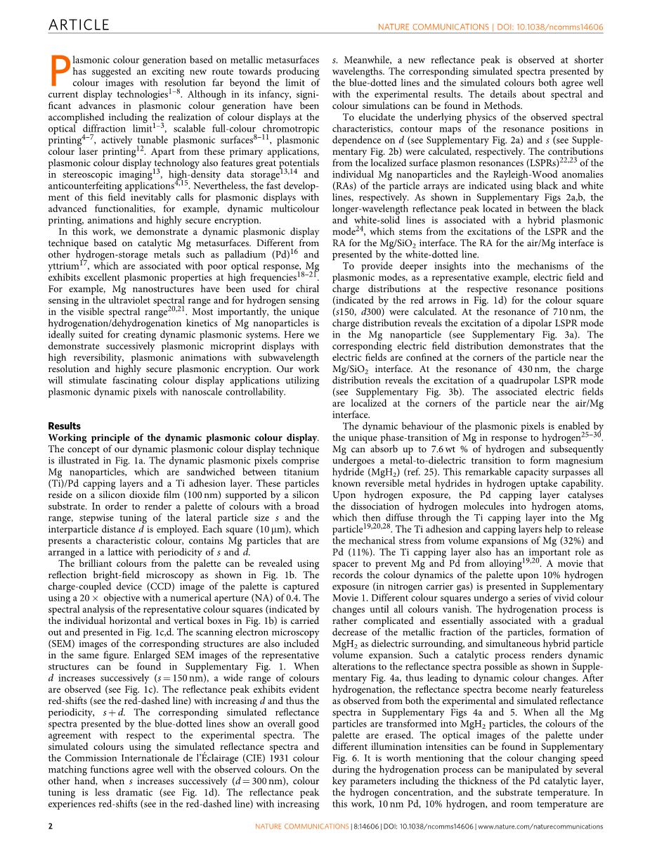 我们的动态等离子体彩色显示技术的概念在图1a。动态等离子体像素包括夹在钛 (Ti)/Pd覆盖层和Ti粘附层之间的Mg纳米颗粒。这些粒子驻留在由硅衬底支撑的二氧化硅膜(100 nm)上。为了呈现具有广泛范围的颜色调色板,采用了横向粒度s和粒子间距离d的逐步调整。每个呈现特征颜色的正方形 (10 mu;m) 包含以s和d的周期性排列成晶格的Mg颗粒。