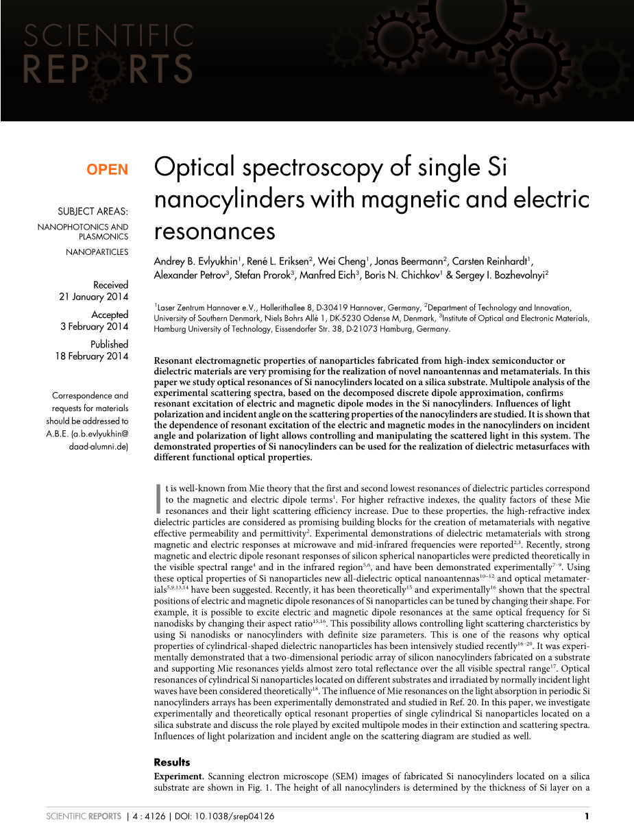 从米氏理论中可以看出,电介质粒子的第一和第二最低共振对应于磁偶极和电偶极项。对于更高的折射率,这些米氏共振的质量系数和它们的光散射效率会增加。由于这些特性,高折射率的介质颗粒被认为是创造具有负有效磁导率和介电常数的超材料的有希望的构件。据报道,介电超材料在微波和中红外频率下具有很强的磁和电反应的实验证明。最近,从理论上预测了硅球形纳米粒子在可见光谱范围和红外区域的强磁和电偶极共振响应,并在实验中得到了证明。利用硅纳米粒子的这些光学特性,人们提出了新的全介质光学纳米天线和光学超材料。最近,理论上和实验上表明,硅纳米粒子的电和磁偶极共振的光谱位置可以通过改变其形状来调整。例如,有可能通过改变硅纳米片的长宽比,在相同的光学频率上激发电和磁偶极共振。纳米片通过改变其长宽比来激发电偶极共振。这种可能性允许通过使用硅纳米盘或纳米盘来控制光散射特性。