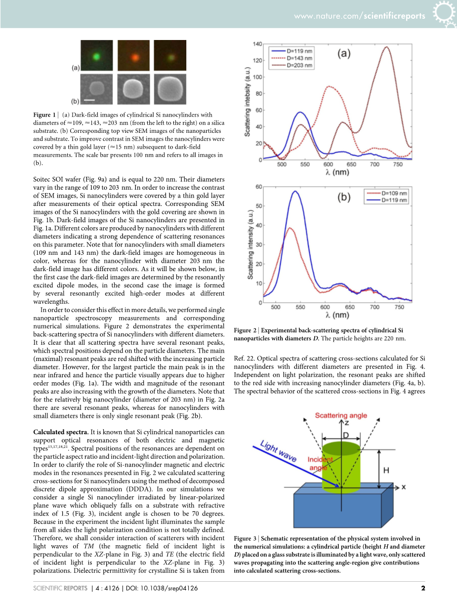 图一:(a) 在硅基上直径为asymp;109, asymp;143, asymp;203 nm(从左到右)的圆柱形硅纳米圆柱体的暗场图像。(b) 相应的纳米颗粒和基底的俯视SEM图像和基底的相应俯视SEM图像。为了提高SEM图像的对比度,在暗光测量之后,纳米颗粒被一层薄薄的金层(lt;15纳米)所覆盖。比例尺为100纳米,指的是(b)中的所有图像。