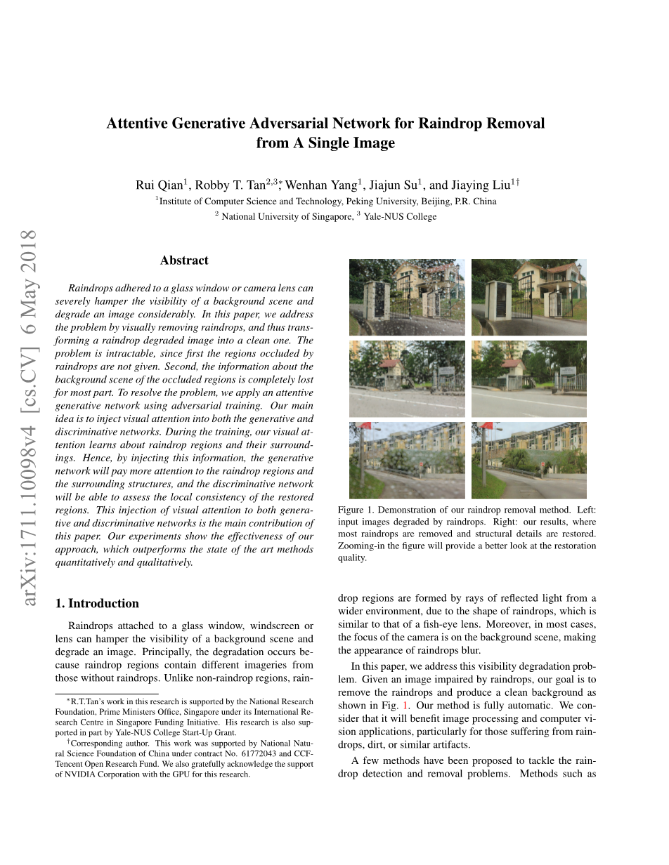 总之,除了引入一种新的雨滴去除方法外,我们的另一个主要贡献是将注意力图注入生成网络和区分网络,这是一种新颖的、有效地去除雨滴的方法,如我们的实验(第6节)中所示。.我们将发布代码和数据集。