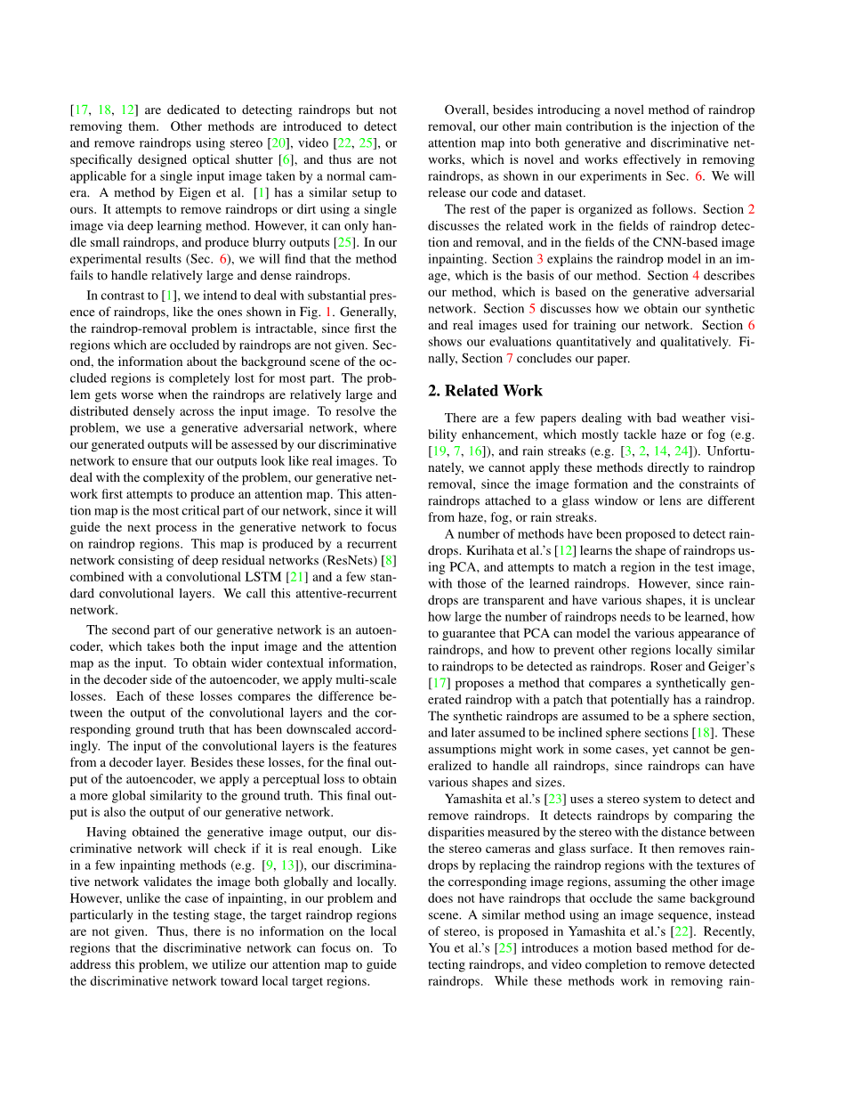 针对雨滴检测和排除问题,之前已经提出了几种解决方法。诸如[17,18,12]等方法专门用于检测雨滴,但不去除雨滴。其他方法采用 stereo(立体)[20]、视频[22、25]或专门设计的光学快门[6]探测和去除雨滴,因此不适用于由普通照相机拍摄的单个输入图像。艾根等人提出的一种方法[1],与我们的相似。它试图通过深度学习的方法,用一幅图像去除雨滴或污垢。然而,它只能处理微小的雨滴,并产生模糊的输出[25]。在我们的实验结果中(第6节),我们会发现,这种方法不能处理较大和密集的雨滴。