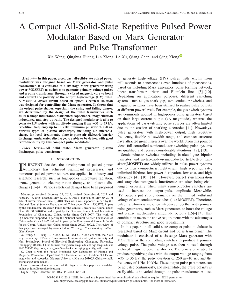 本文提出了一种基于Marx电路和脉冲变压器的全固态紧凑型脉冲调制器。该调制器由六级Marx发生器组成,以MOSFET作为控制开关,产生一次电压脉冲。然后脉冲电压通过一个闭合的磁芯变压器提高。发生器能够产生重复脉冲与输出电压从minus;35~35 kV,脉冲持续时间250ns~10us,和1 Hz~10 kHz的频率。这些输出脉冲参数可以连续调整,同时,脉冲变压器很容易改变脉冲极性。最后, 利用该小型脉冲发生器对不同类型的等离子体放电气体和水介质进行了击穿实验。在等离子体的应用和基础研究方面,实现了具有良好重现性的放电。