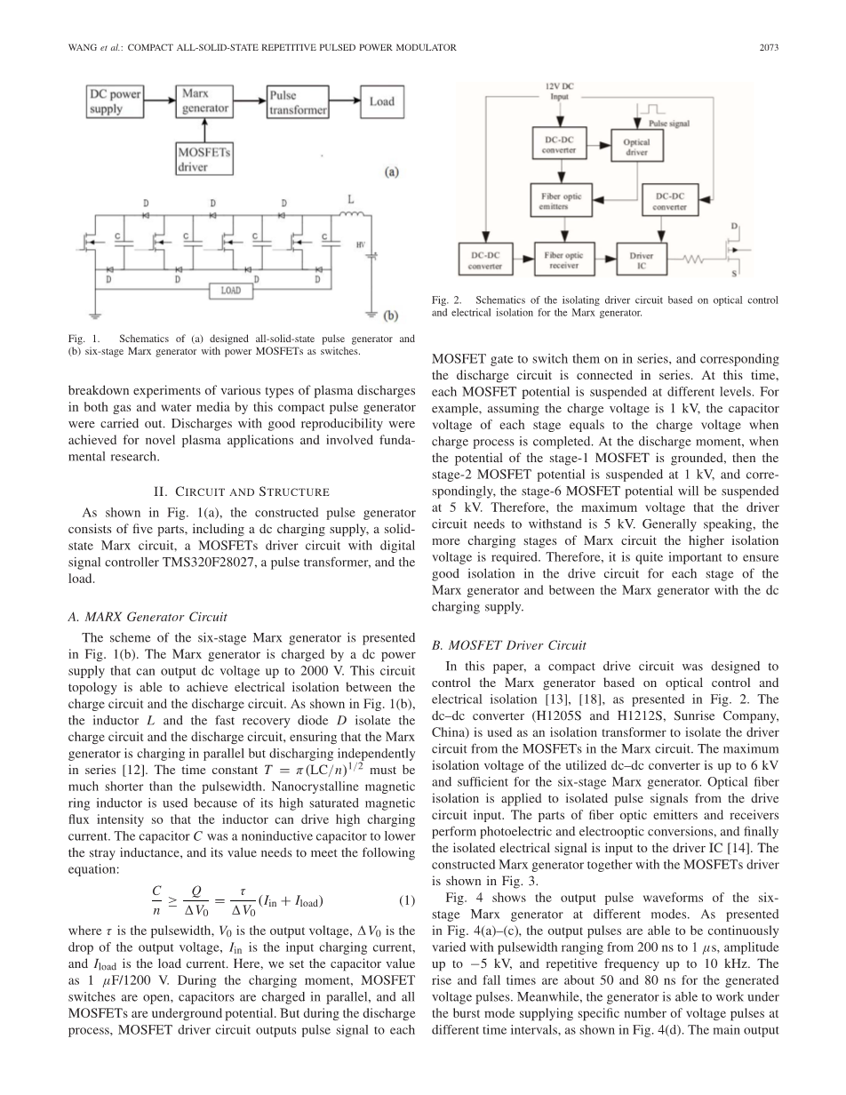 以马克思发生器和脉冲变压器为核心,设计了一种紧凑的全固态脉冲功率调制器。它由一个六级Marx发生器和一个脉冲变压器组成,前者利用功率MOSFET作为开关来产生初级电压脉冲,后者通过一个封闭的磁芯来提高和转换输出高压脉冲的极性。设计了一种基于光电隔离的MOSFET驱动电路来控制Marx发生器。结果表明,脉冲变压器的漏电感、分布电容、磁化电感、升压比等参数决定了输出脉冲的形状,特别是上升和下降阶段。所设计的调制器能够产生幅值为 -35 ~ 35kv、重复频率为10khz、最小脉宽为250ns的高压脉冲。该小型脉冲调制器能够驱动各种类型的等离子体放电,包括局部处理的空气微放电、板对板空气介质阻挡放电、水下放电,具有良好的重现性。全固态,马克思发生器,等离子体放电,脉冲变压器。