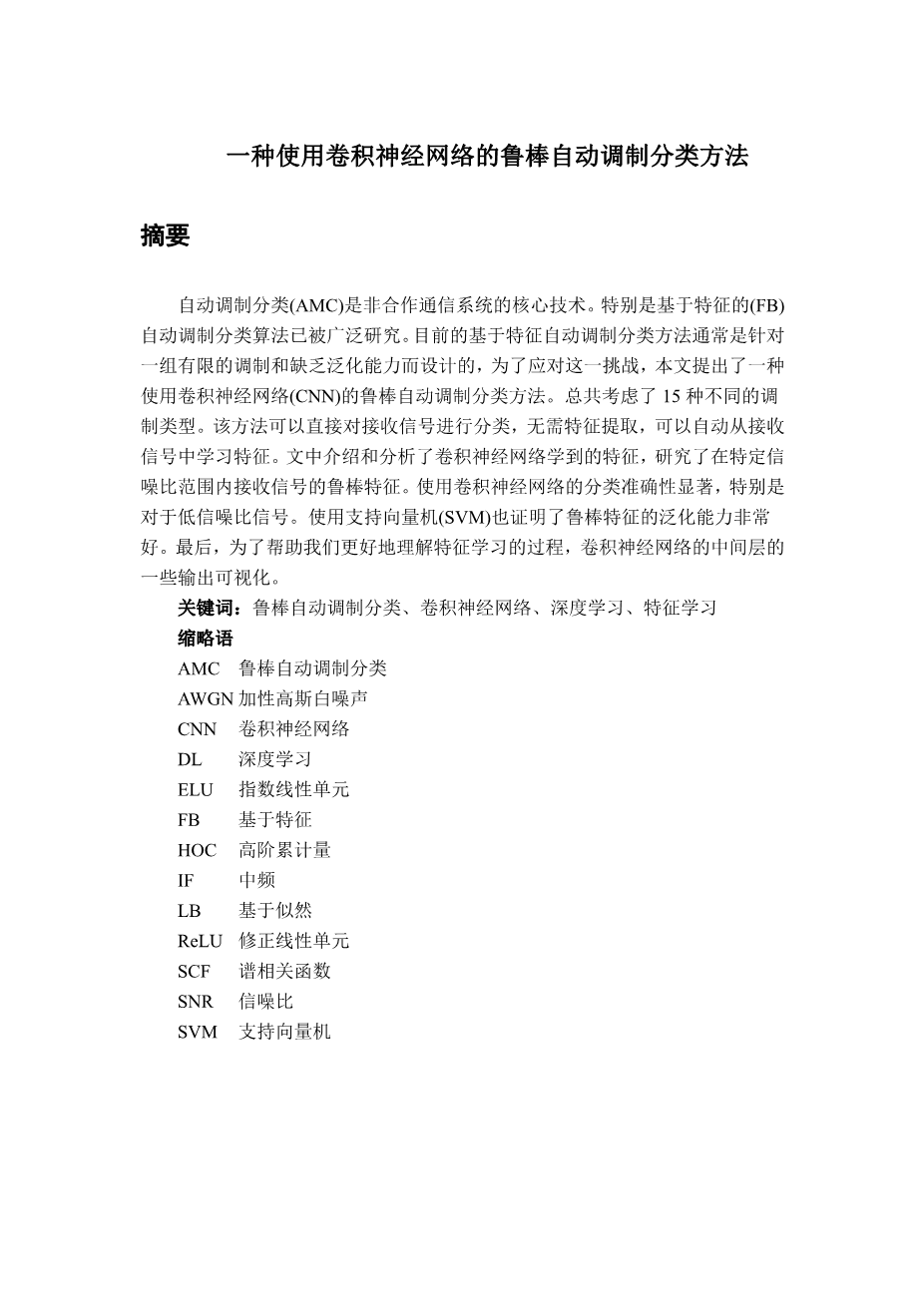 一种使用卷积神经网络的鲁棒自动调制分类方法外文翻译资料 2021-11-06 17:45:11 英语原文共 15 页 英语原文共 18 页 原文和译文剩余内容已隐藏,您需要先支付 30元 才能查看原文和译文全部内容!立即支付 发小红书推广免费获取该资料资格。点击链接进入获取推广文案即可: Ai一键组稿 | 降AI率 | 降重复率 | 论文一键排版 PREVIOUS NEXT 您可能感兴趣的文章 看边界:边界感知面部对齐算外文翻译资料 看边界:边界感知面部对齐算外文翻译资料 一种支持分布式正态智能监控的多代理体系结构外文翻译资料 增强的无线局域网协作MAC外文翻译资料 近眼显示器的绝对辐射和光度测量外文翻译资料 红外遥控系统外文翻译资料 一幅单一图像中雨滴去除的专注生成对抗性网络外文翻译资料 深度残差学习在图像识别中的应用外文翻译资料 低成本,便携式室内环境质量监测装置的设计与开发外文翻译资料 使用基于查询蓝牙的RSSI概率分布进行室内定位外文翻译资料